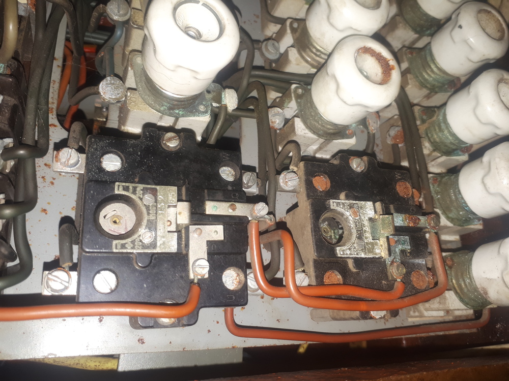 No to su práve tie nadprúdové ochrany motora. Tieto sú pôvodné ešte z čias Márie Terézie. Každopádne fungovať ešte môžu. Pri preťažení motora alebo výpadku jednej fázy (to mohla spôsobiť aj tá poistka) prerušia obvod na cievku stykača a všetky fázy. Preto ti to ide, ak manuálne zatlačíš na ten stykač. Pre sfunkčnenie tej ochrany ju musíš nahodiť - zatlačiť jazýček. Ten by mal zostať zaaretovaný.