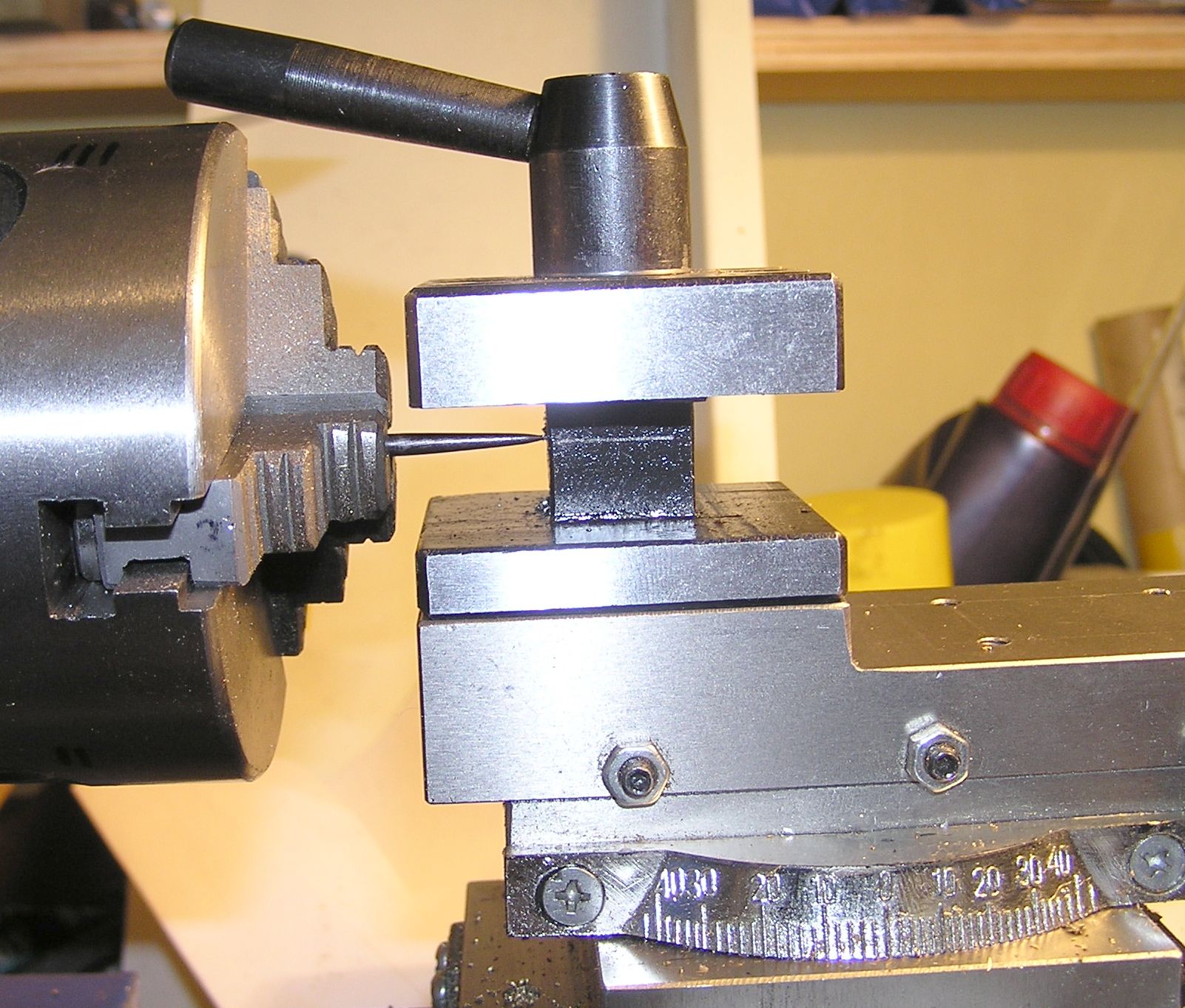 Koníka si nastavíš oproti vřeteni na nulu a zajisti ho svrtáním nebo aby jsi s tím nešteloval.Když bodeš chtít točit nějakej ten kužel tak v hrotech.Do vřetena pevný a do koníka prdneš vyvrtávací hlavu která bude mít místo vyvrtávacího nože radeco vybroušený jako pevný hrot.Můžeš to štelovat s 0,02 přesností a uděláš si kužel jakej budeš potřebovat,ovšem při delších věcech to chce větší točnou délku