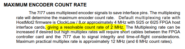 Podle datasheetu 7i77 by měla být nejmenší frekvence 2 MHz, doufám že tím myslí na každý enkodér. Podle výpočtu by při maximální rychlost 4 m/min a velikosti pulzu 0,5 μm měla být frekvence 133 KHz, takže by to s velkou rezervou mělo pro můj pomalý stroj stačit