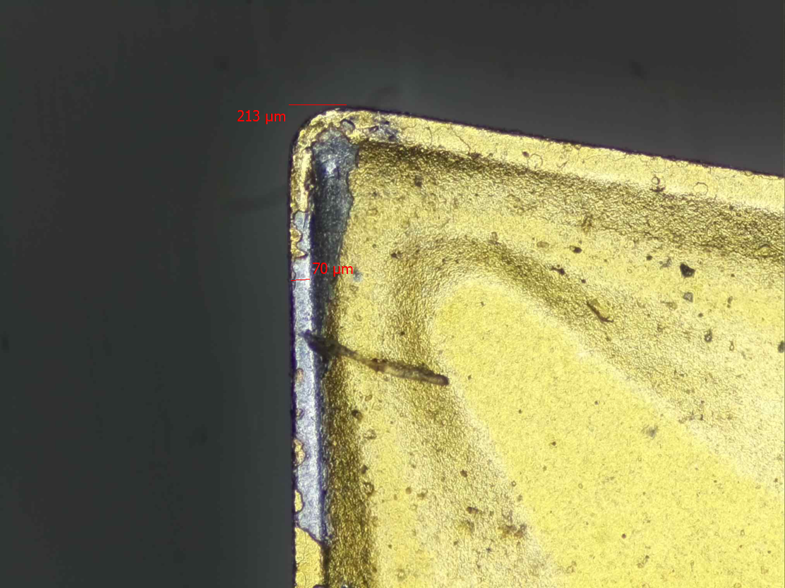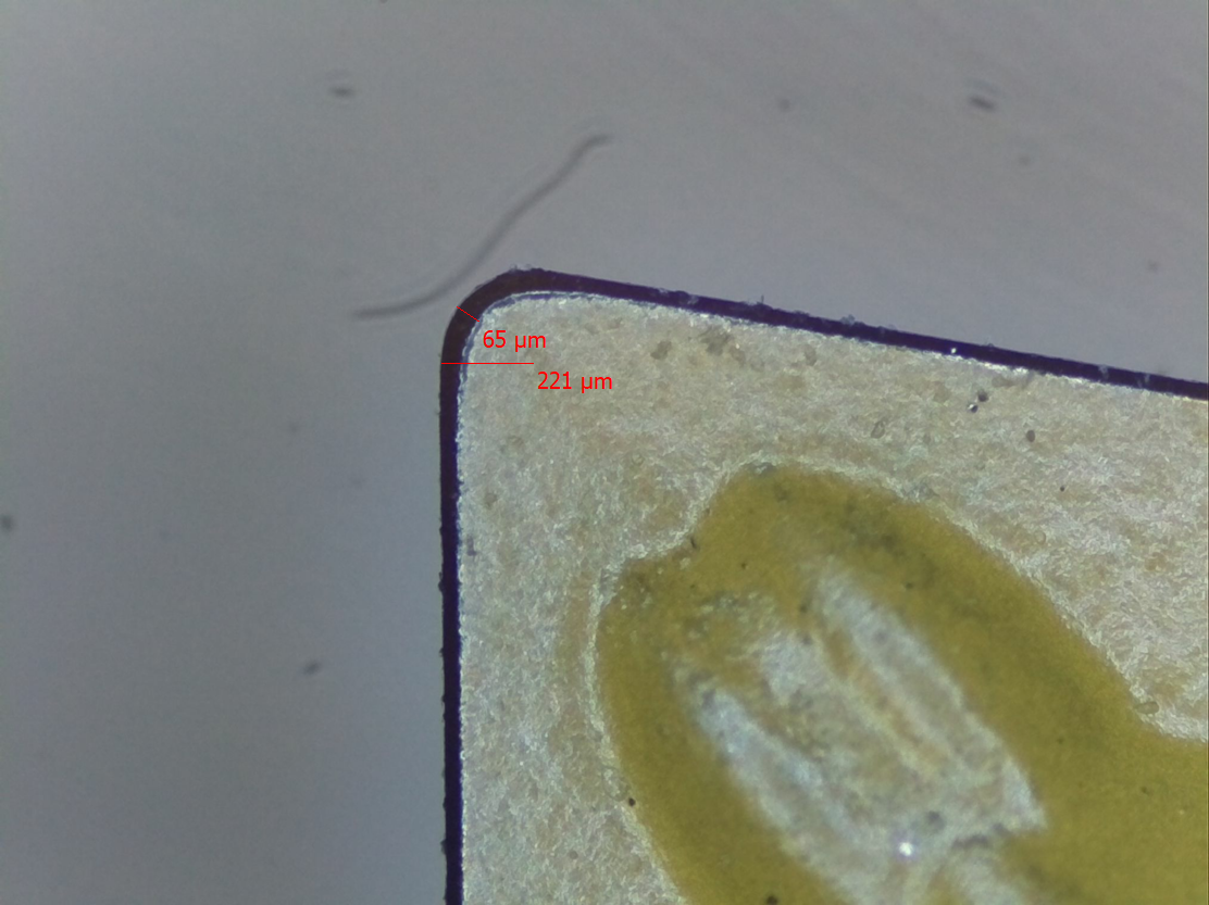 Je vidět, že jednak povlak moc nedrží, ale hlavně se není čeho chytit s měřením (vadí zbytky utvařeče), takže radius je "tak nějak" (snažil jsem se pod tři stovky).