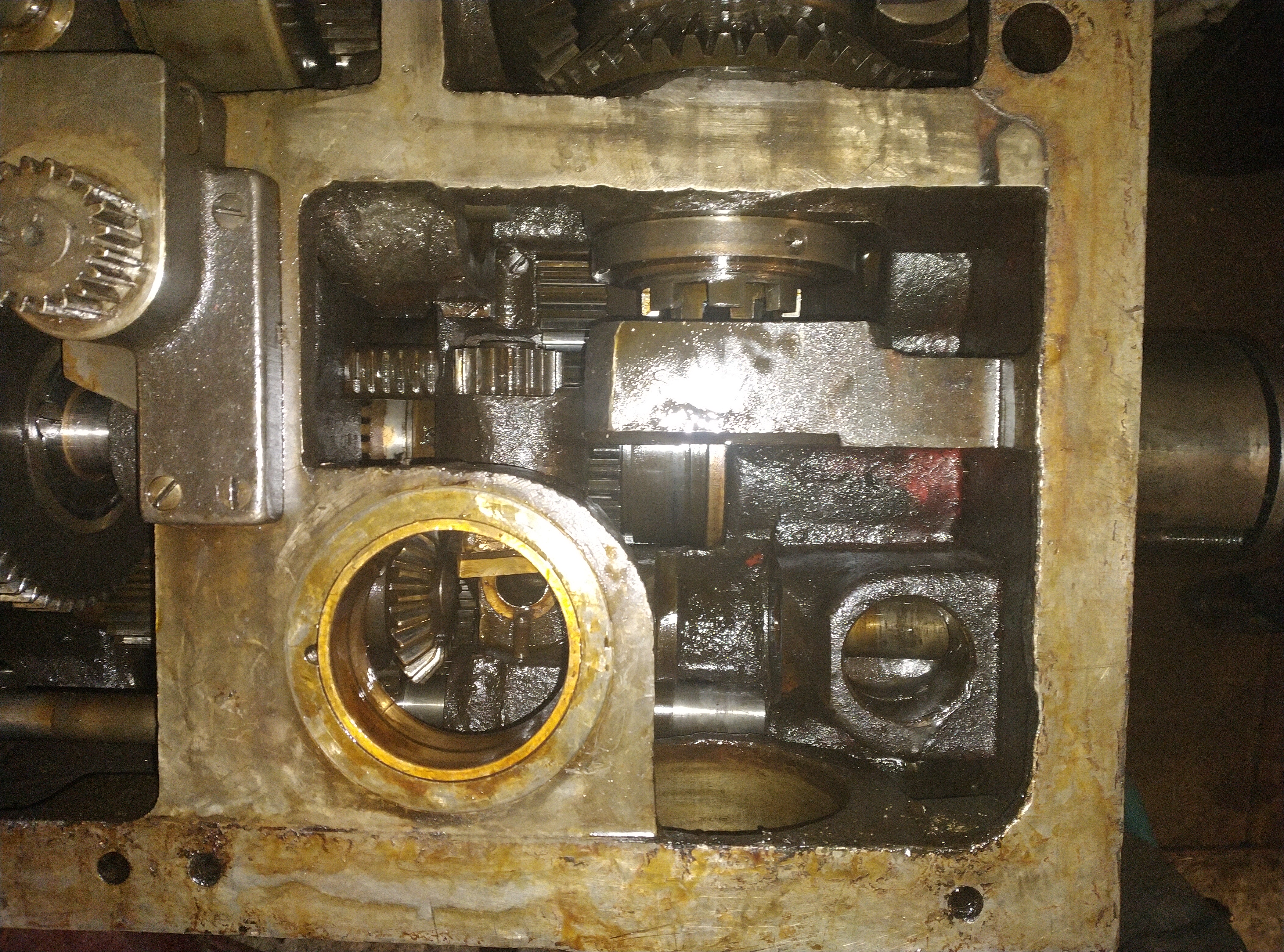 Mezi svátky jsem to nevydržel a zkusil trochu rozkuchnout vřeteník abych zjistil co bude potřeba vyměnit nebo opravit. Věděl jsem, že pod lícní deskou jsou očesaná dvě kola pohonu příčných saní, ale zajímalo co bude vevnitř. Počítal jsem, že minimálně budu měnit ložiska na hřídelích, ale změna je život. Celý vřeteník je na kluzných ložiskách. Takže pokud jsou někde větší než zcela zdravé vůle, mám dvě možnosti, buď to celé opravit někde jinde na horizontce nebo se s tím naučit žít a mazat a mazat...