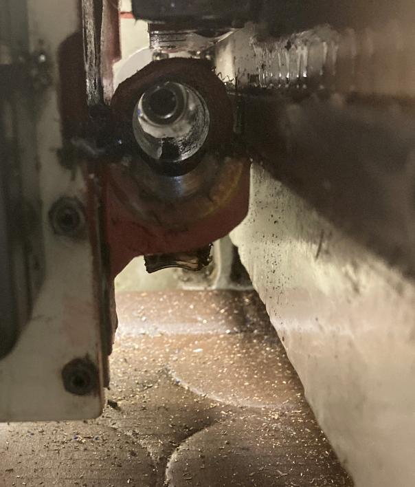 opět suport co nejvíc doleva, odšroubovat kluzné ložisko vpravo a trochu zapáčit aby vyskočily kolíky - ložisko sundat