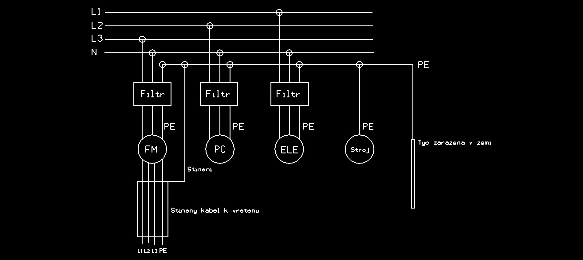 Konečně jsem s potížemi dofrézoval všechny části trupu. Bohužel chyba "chyba komunikace" se stále opakuje. Ikdyž s menší četností. Bohužel nepomohlo ani galvanické oddělení COM portu. Jsem přesvědčen o tom, že původ problému je v FM a celkové špatné el.instalaci. Rád bych to předělal a tímto bych chtěl požádat znalé věci zda by nemohli trochu pomoci. Vytvořil jsem schematický nákres jak to mám udělané v současné době a další nákres je stav na který bych to rád předělal. Potřebuji to zkonzultovat, zda je to správně nebo opět blbě. Na vstupu stroje je čtyřkulíková zásuvka. V jističích mám spojené "modré a zelené" - staré zapojení. Rád bych použil odrušovací filtry. Je otázka, zda dát filtry i před PC a elektroniku nebo jen před FM. Vybral jsem tento filtr http://www.pohony-menice.cz/gds/18-sito ... 4200-6122/. Opět nevím, zda je použitelný, nebo zvolit jiný (jaký). Ve stávajícím FM je integrovaný filtr typu B. Předem díky za pomoc.