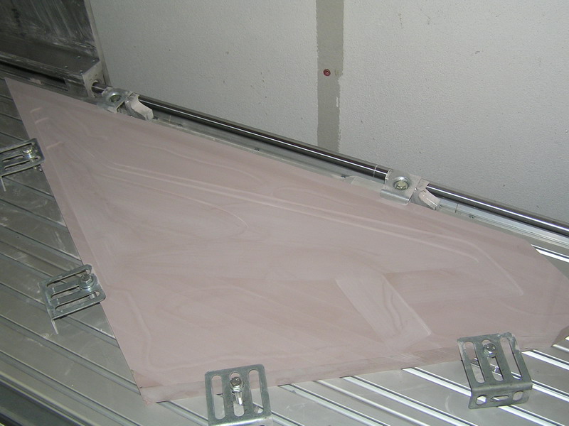 Tak se mi konečně s největší pravděpodobností podařilo odstranit "Chybu komunikace" v Armote. Před FM jsem dal síťový filtr a předělal elektriku stroje. To bohužel k ničemu nevedlo - chyba se stále opakovala - jen další vyhozený peníze a čas. Pak jsem se soustředil na tu klávesnici (má kovový obal). Pokud jsem zapnul vřeteno a dotknul se klávesnicí stroje tak se výrazně změnily navolené otáčky - to je asi špatně... Takže jsem začal vymýšlet jak odizolovat klávesnici. Nejdříve mě napadlo ji nějak uzemnit pak jsem uvažoval, že ji dám mimo stroj - ale to se mi moc nelíbilo. Nakonec jsem byl jednou v noci "osvícen" a napadlo mě úplně jednoduché řešení - použít bezdrátovou klávesnici. Půjčil jsem si ji od kamaráda, ale tam byl problém v tom, že byla na 27Mhz a byl problém s rušením od stroje. Nakonec to vyřešilo pásmo 2.4 Ghz. Nechci to zakřiknout, ale teď jsem nafrézoval cca 6hodin a bez problému. "Chyba komunikace" se objevila již jen jednou, ale ne při obrábění, ale při použití MPG při nastavování nuly. Respektive ne při jeho používání, ale ve chvílce, když jsem zavřel okno MPG. Ale to je asi spíš dotaz na Gravos .... (stalo se to jenom jednou - FM neběžel, KM se nehýbaly) Jinak při obrábění se to již nevyskytlo. Ta klávesnice byla pravděpodobně jako enténa. Na fotkách je výsledek mého snažení - pracovní forma na směrovku z umělého dřeva - rozměry 900 x 400 mm.