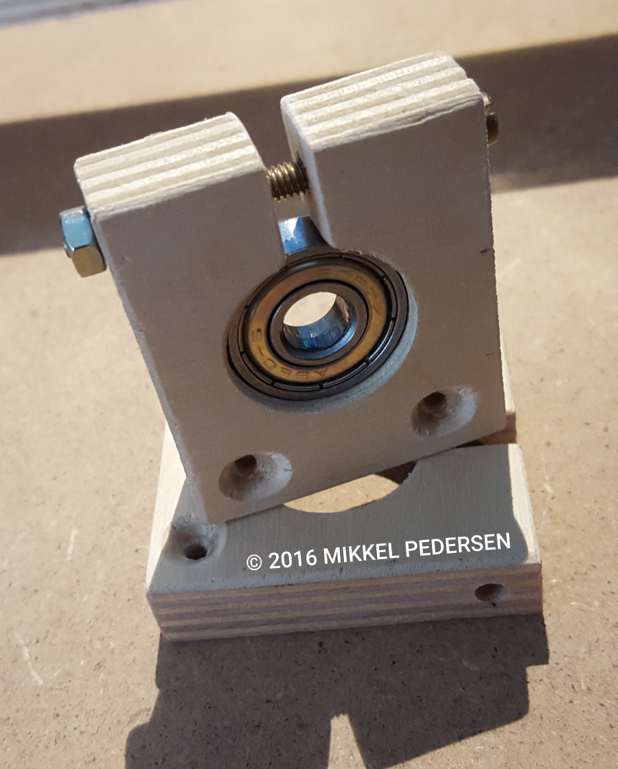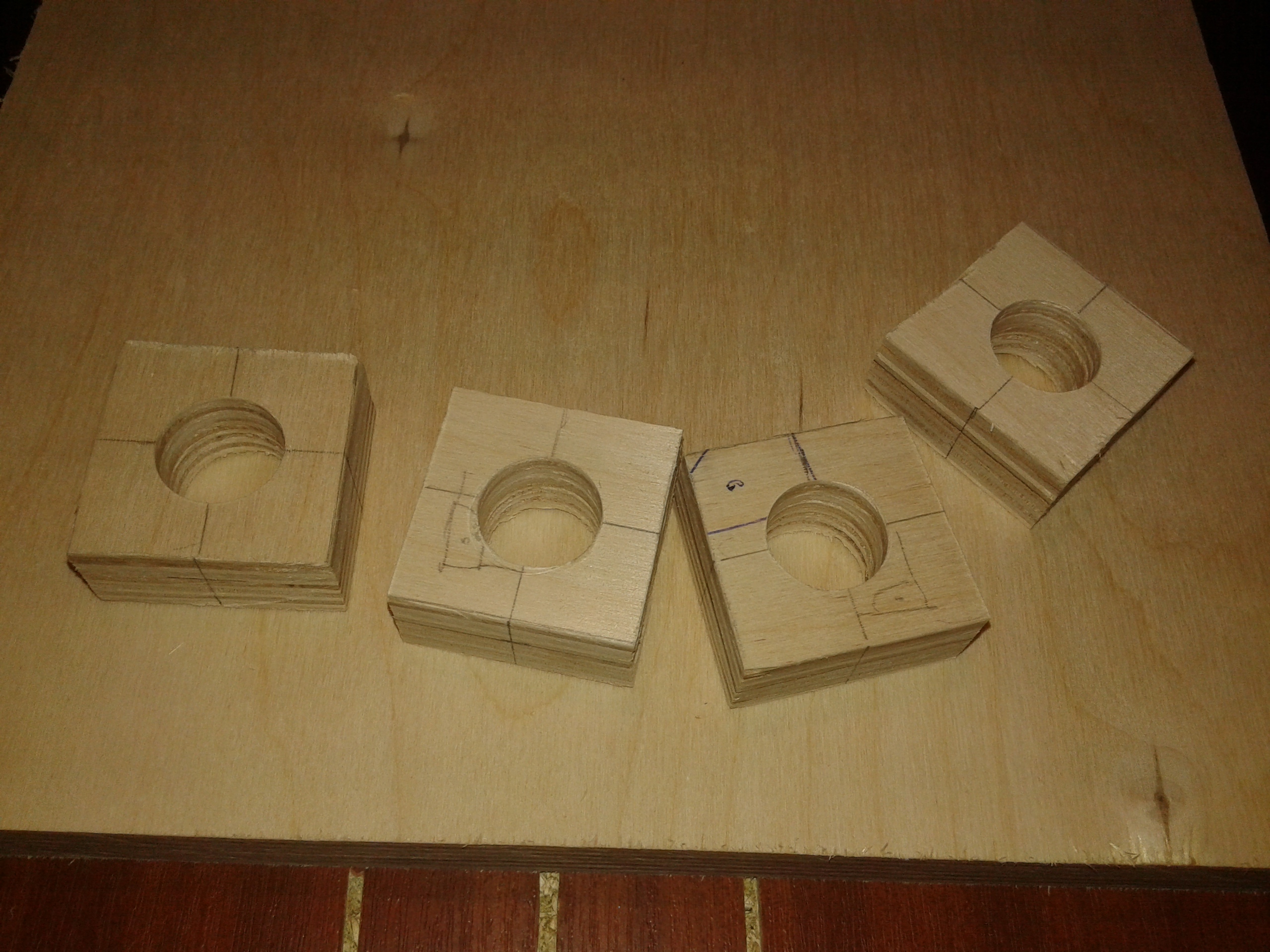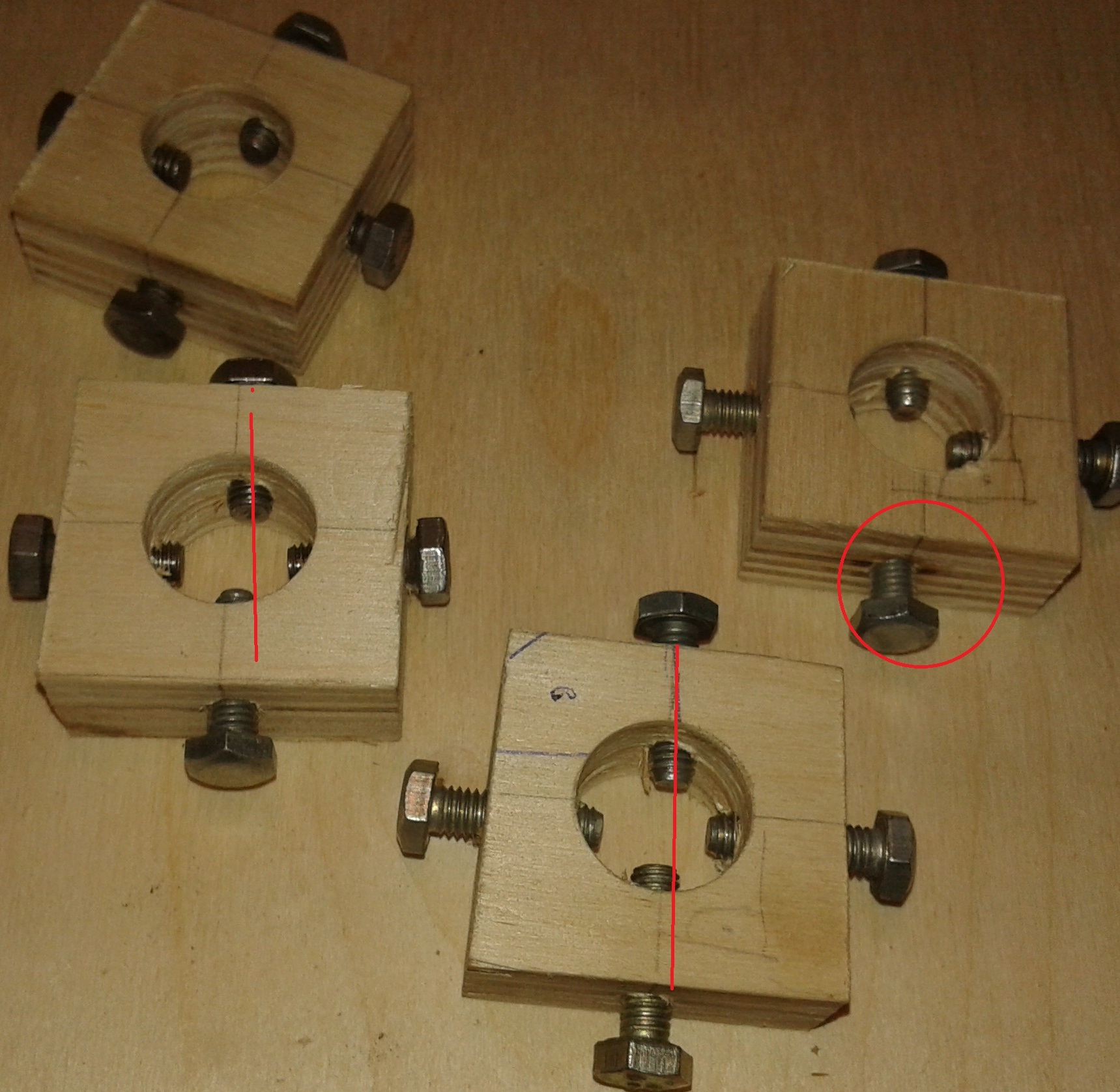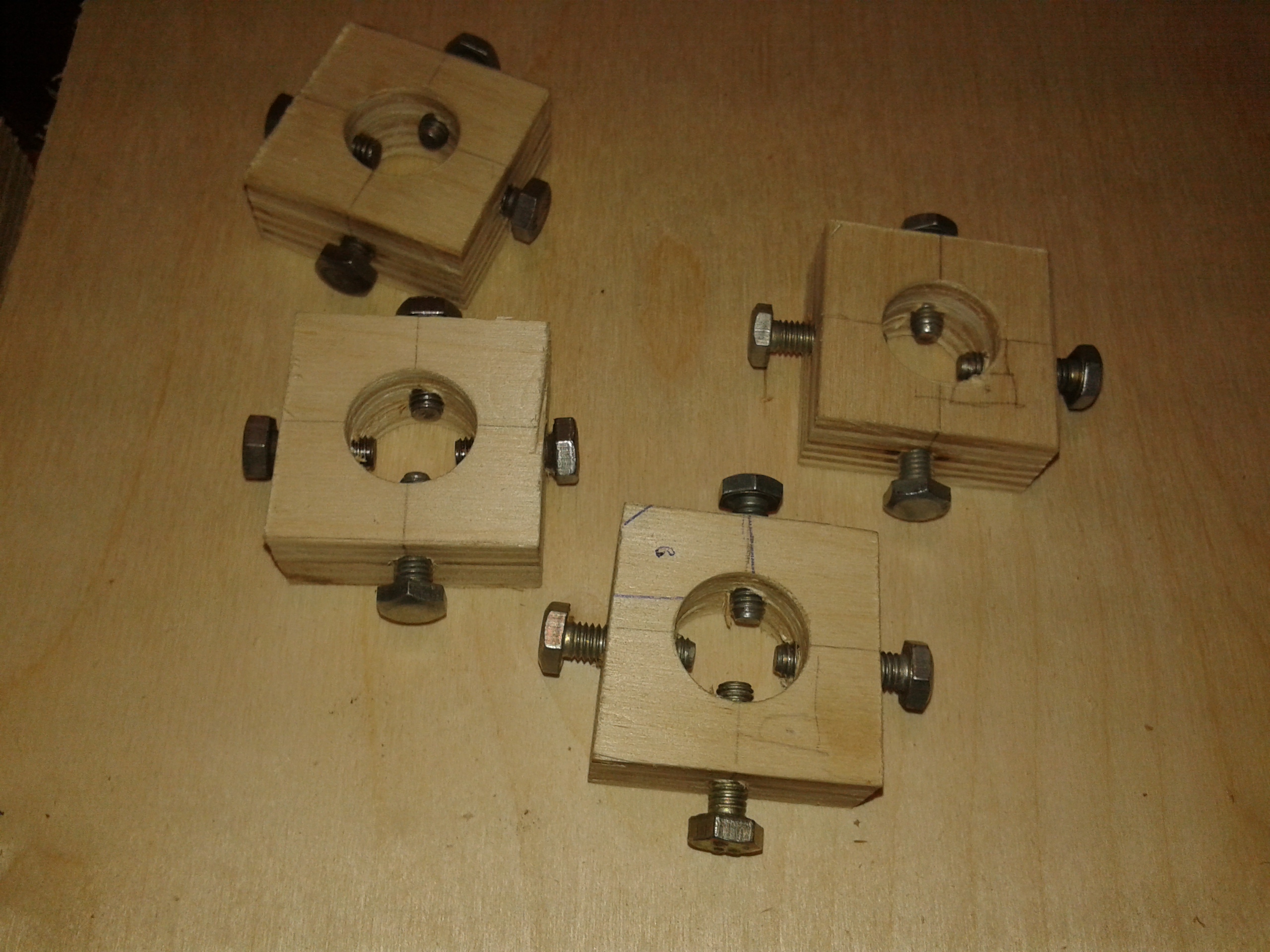 Ale proč místo těch pracně vyráběných centrovačů nepoužiješ standardně vyráběné a prodávané konzoly, které jsou na upevnění tyčí přímo určené? Ty konzoly mají volnější díry pro šrouby, takže po mírném utažení můžeš tyče jemným poklepem dostavit do správné polohy, pak s citem dotáhnout a ty konzoly v definitivní poloze přilepit epoxidem k překližkové konstrukci. Případně můžeš zbytkem epoxidu vylít ty volné díry okolo tyčí a budeš to mít ustavené jednou provždy.