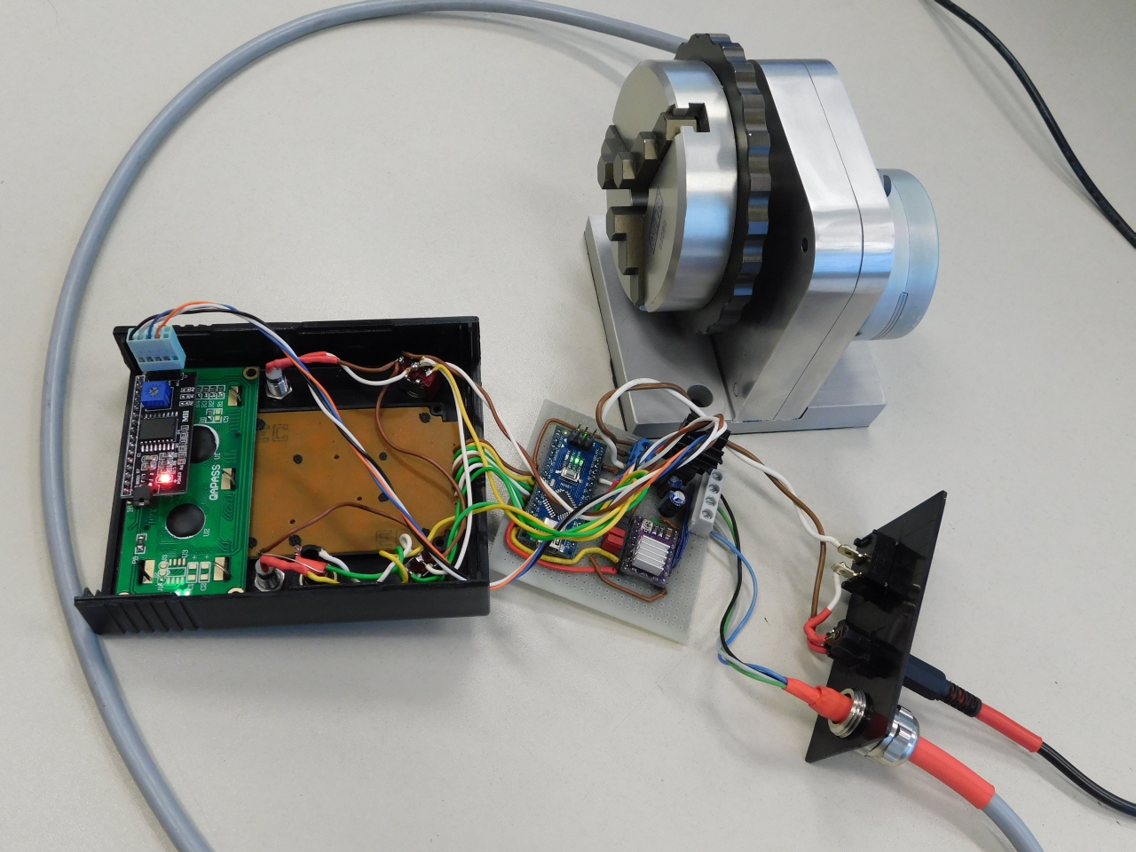 Vyrobil jsem si rotační osu pro měřící profilprojektor, abych nemusel otáčet a nastavovat úhly manuálně. Teď stačí zadat požadovaný úhel, a pak už jenom mačkám tlačítko. Vyrobeno z šuplíkových zásob, krokový motor z tiskárny, uvnitř těla ozubený převod 1:6, sklíčidlo D80 z Alufix. Řízení pomocí Arduino Nano.