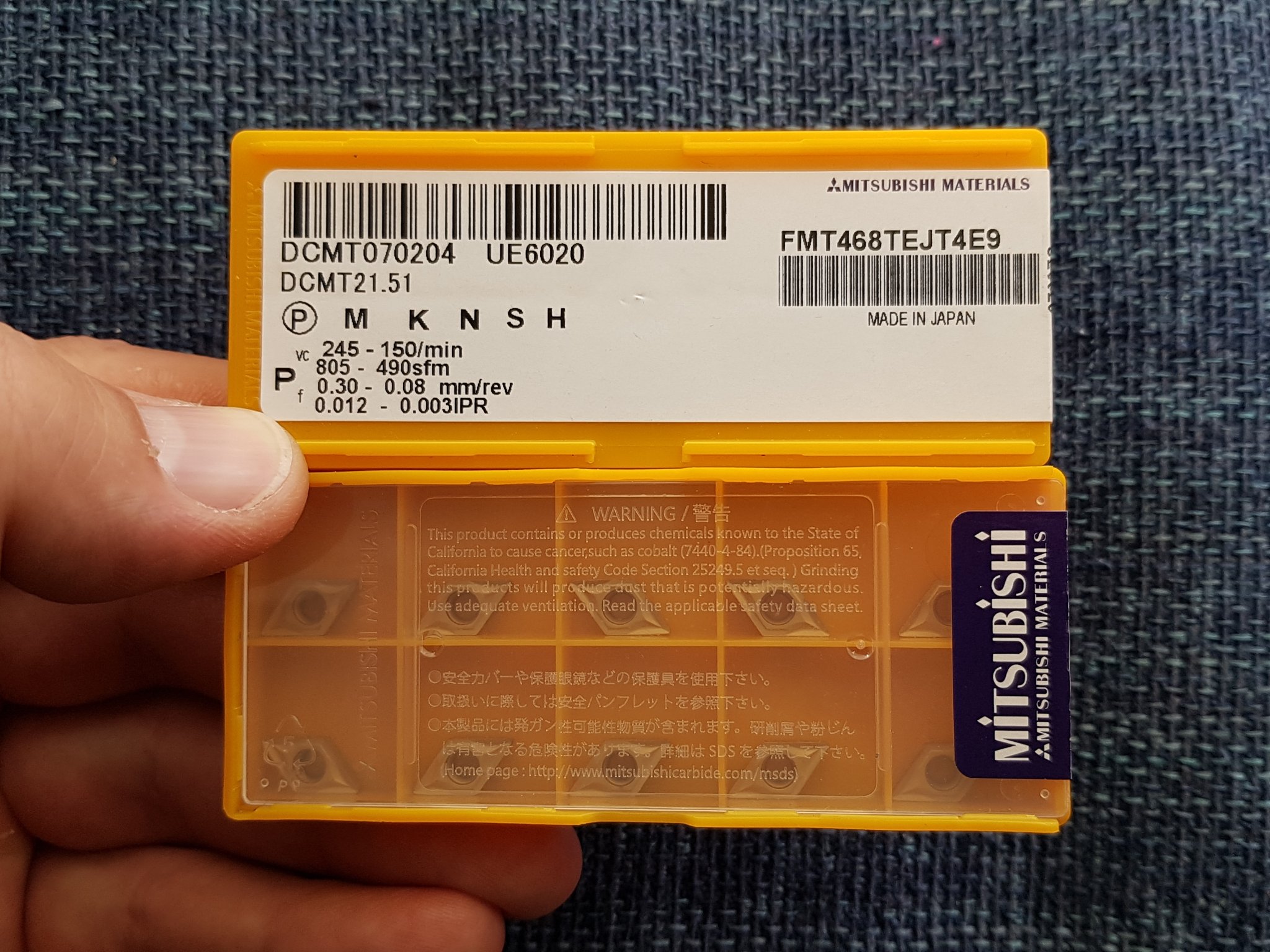 Např. tady používám plátek (i držák) z levné DCMT sady, kterou jsem pořídil já (závit až tak dobře nešel /také levná sada/, ale zrovna Milan199 psal, že jsem málo mazal, takže asi spíš moje chyba, taky to nejsou pro karbid zrovna ideální řezné podmínky).