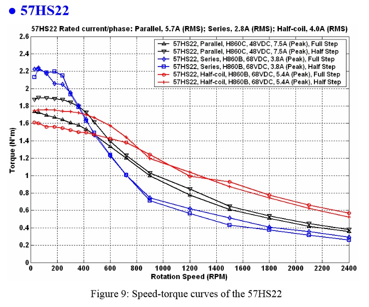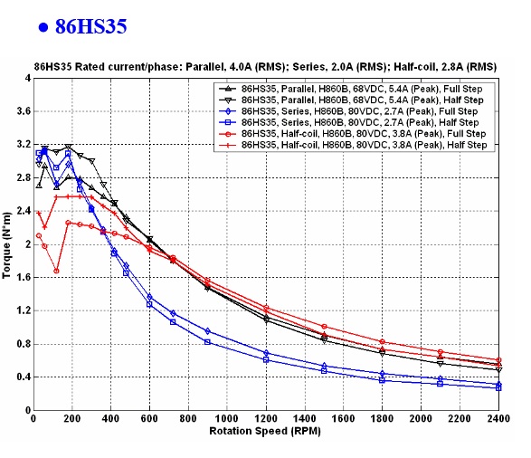 Half-coil u osmivyvodoveho motoru nema podle mne zadny smysl - indukcnost zustane stejna a jen by byl zbytecne dvojnasobny odpor vinuti (paralelni spojeni vinuti je stejne, jako by vinuti bylo navinuto dratem s dvojnasobnym prurezem)Thomeeque píše:Toto zapojení je pro unipolární driver, M542 (stejně jako naprostá většina ostatních) je driver bipolární. Otevři si návod k M542 a vyber si jednu z možností zapojení, které jsou uvedeny pro osmivývodový motor tam. Teď koukám, že pro 8mi vývodový motor tam není uveden ten half-coil, což mě trochu mate, imho by taky mělo jít, ale trochu jsem znejistěl. Nicméně já bych se na half-coil stajně vykašlal, zapojil bych paralelní konfiguraci, imho to bude při těch 4,2A/fázi šlapat stejně nebo líp než half-coil (u těch grafů je potřeba si všimnout, že paralelní zapojení testovali na 48V zatimco half-coil na 68V, což je sakra rozdíl, který se projeví při vyšších otáčkách).