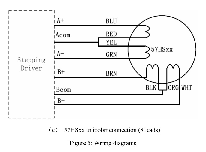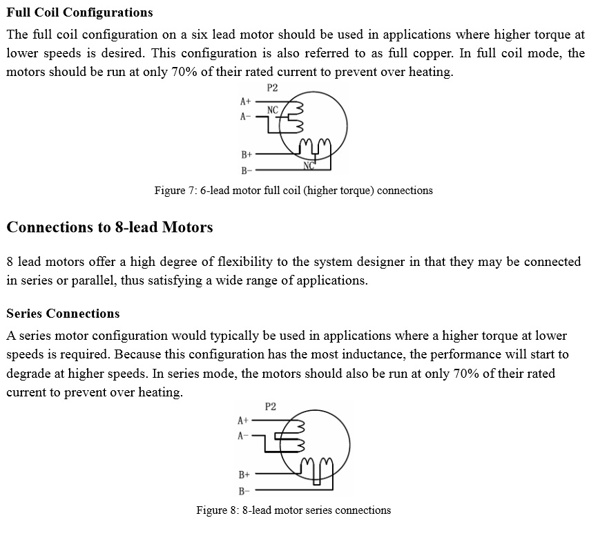 Prostě krokový motor má pro každou fázi dvě cívky (zjednodušeně řečeno, je jich tam víc, ale z vnějšku se to takto tváří*). Ty se dají zapojit buď do série (full-coil configuration) nebo paralalně (parallel configuration) nebo je možno budit pouze jednu z nich (half-coil configuration). Motory s osmi dráty umožňují koncovému uživateli všechny tyto kombinace, šestivývodové (tipicky) buď full-coil nebo half-coil. Čtyřvývodový se tvářej jako jedna cívka na fázi.