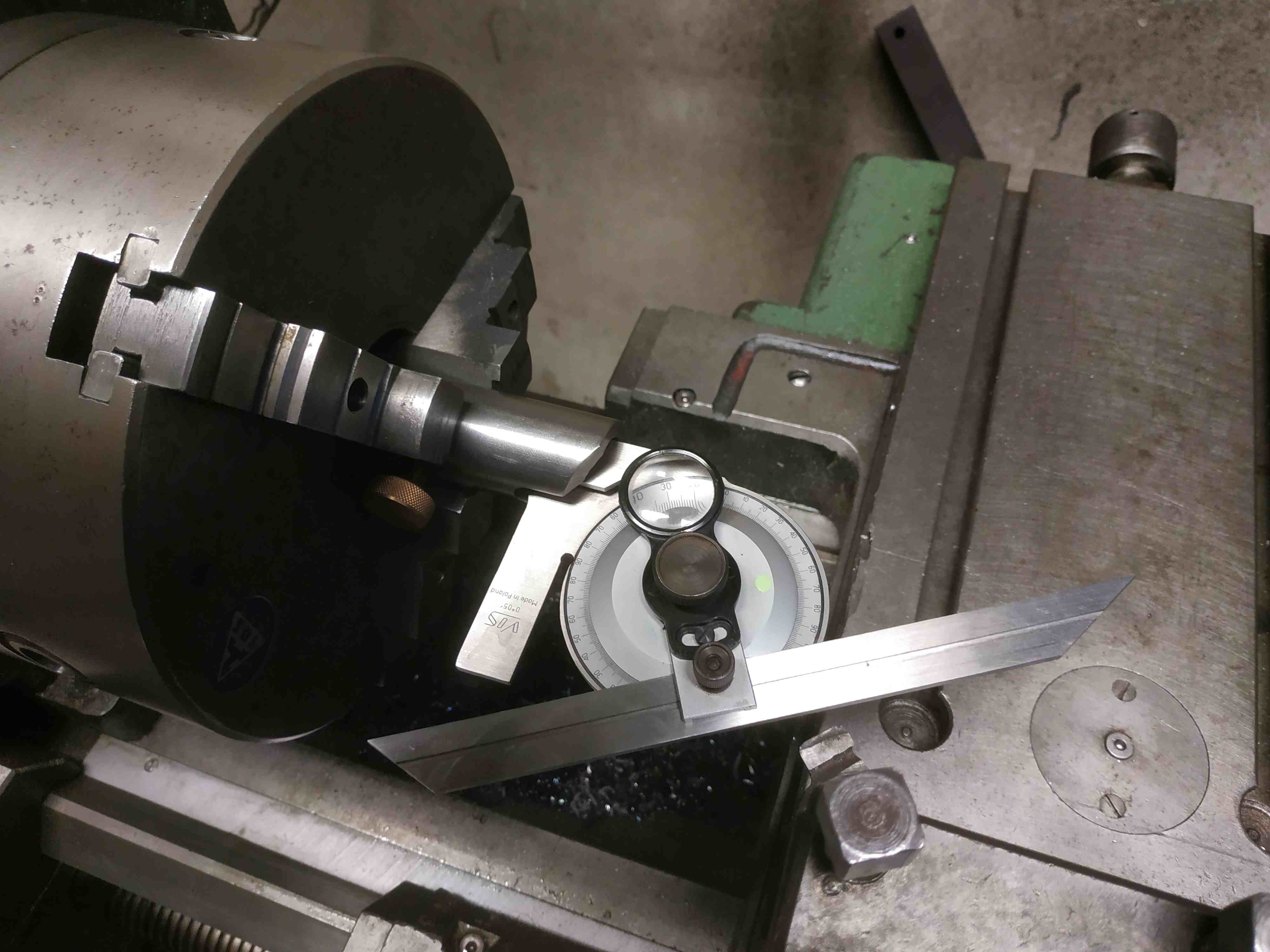 Vyrobíš, nastavíš úhel na úhloměru, upneš pomocí přípravku do soustruhu, nastavíš nožovů hlavu pomocí hodinek, kerýma jezdíš po nastaveným ůhloměru(který je vodorovně) a doklepáváš na nulu.