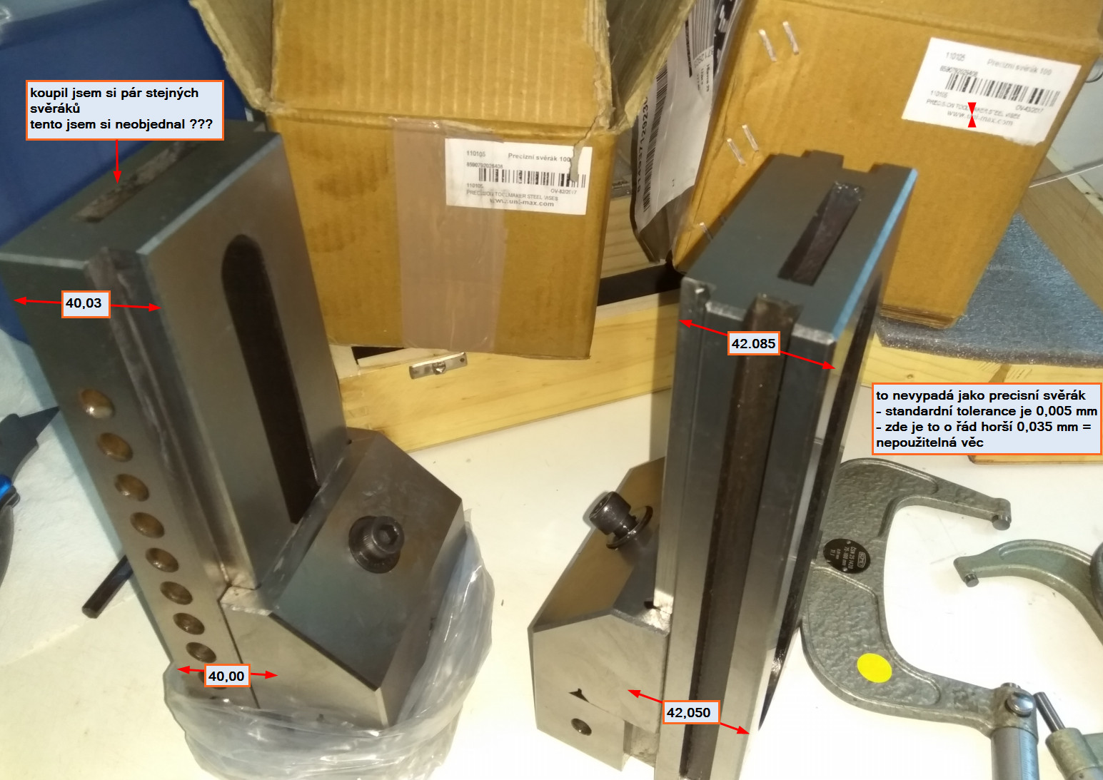 Nějak nechápu kde že máš problém. Mám upnutý svěrák z pohledu jeho šířky - dvě kulatinky - mezera - žlábek kam zapadá příčný čep - mezera - kulatinky upínky na druhé straně. Prostě pro pohyb příčného čepu je tam dost místa. Upínací kulatiny nemusí být dlouhé přes celou šířku svěráku a příčný čep u mne také není nijak dlouhý. Nebo mluvíš o něčem jiném ?celeron píše:Na imbus to můžu kdykoliv změnit, stačí dojít koupit správnou dýlku.chb píše: Imbus je tam proto, aby "upnutí" nepřesahovalo nad spodní plochu svěráku pro upnutí delších kusů.Ale narazil jsem na mrzutost s kterou nelze nic moc dělat. Pokud je potřeba přehodit příčnej čep v místě upínacích kostek, tak se musej kostky demontovat, přesunout čep a zase znova celej svěrák vyůhlovat. Bohužel mám stůl na frézce hodně úzkej a tak se svěrák upnout mimo předpokládanou polohu čelistí nedá. Možná trochu uvolnit čep a z jedný strany do něj udělat závit na vytahovák a povolovat jen jednu upínací kostku na straně kam se bude čep vytahovat. Zkusím to, snad se svěrák na jedný kostce udrží a vyůhlování zůstane.