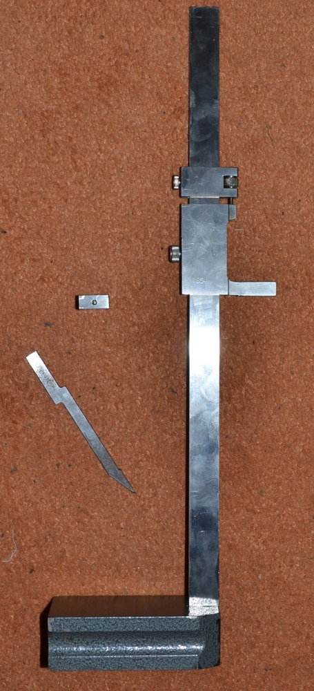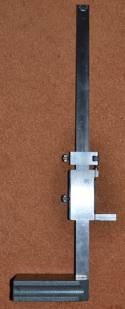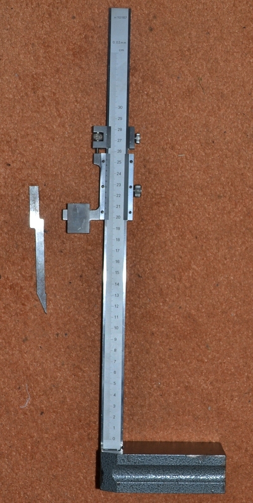 Výškoměr analogový 300mm; 0,02, zalomený šroub ve třmenu jehly (ta je částečně okousaná) a hnusně (ale funkčně) opravená upevňovací kostička sloupku (jen přitlačuje, nemá vliv na geometrii). 1800Kč