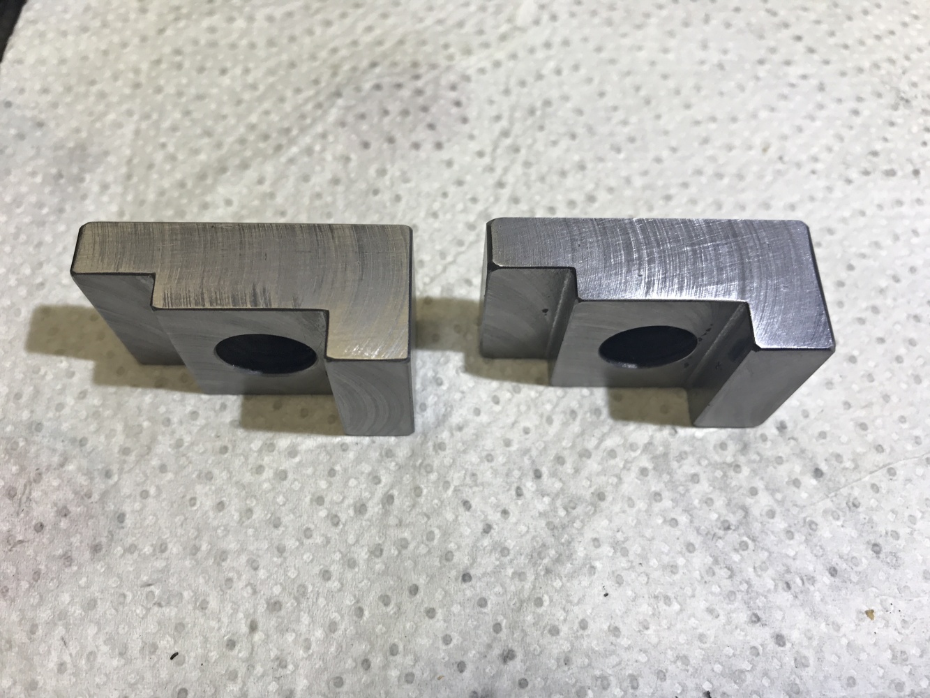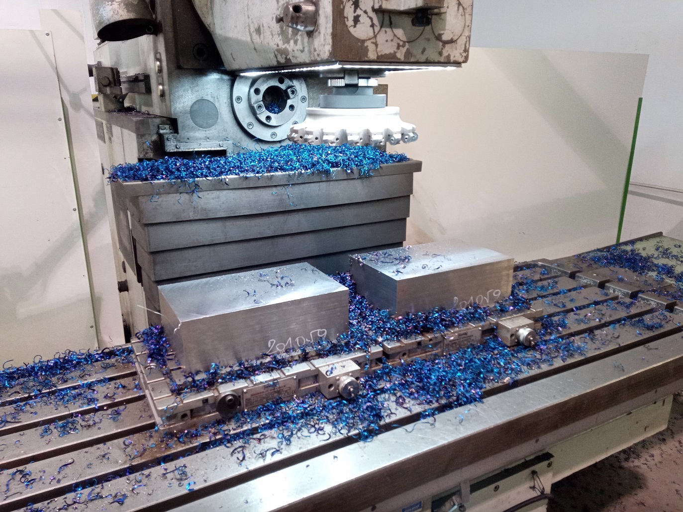 Odpilok sa nahodí na magnet pílenou stranou, vypodkladá sa tenkými plechmi, prípadne papierikmi aby sa nehojdal a vrchná strana sa zrovná. Potom sa otočí na zrovnanú stranu a už sa tomu môže valiť len také prdy. Ako som písal 250mm fréza so 16ks plátkami robí bez problémov pri 180 otáčkach s posuvom 315mm/min, s hrúbkou triesky 1mm do bežnej tepelne nespracovanej K110. Žiadne obklady lištami ani nič podobné sa nekoná. Kto mi neverí, šup na inšpekciu, tento týždeň budem frézovať bloky z 19552 a 19663 takýmto spôsobom.