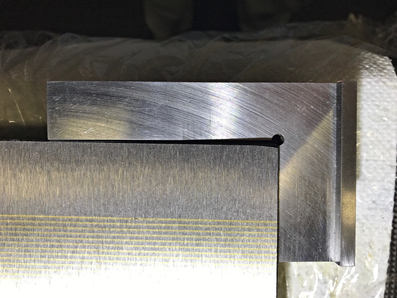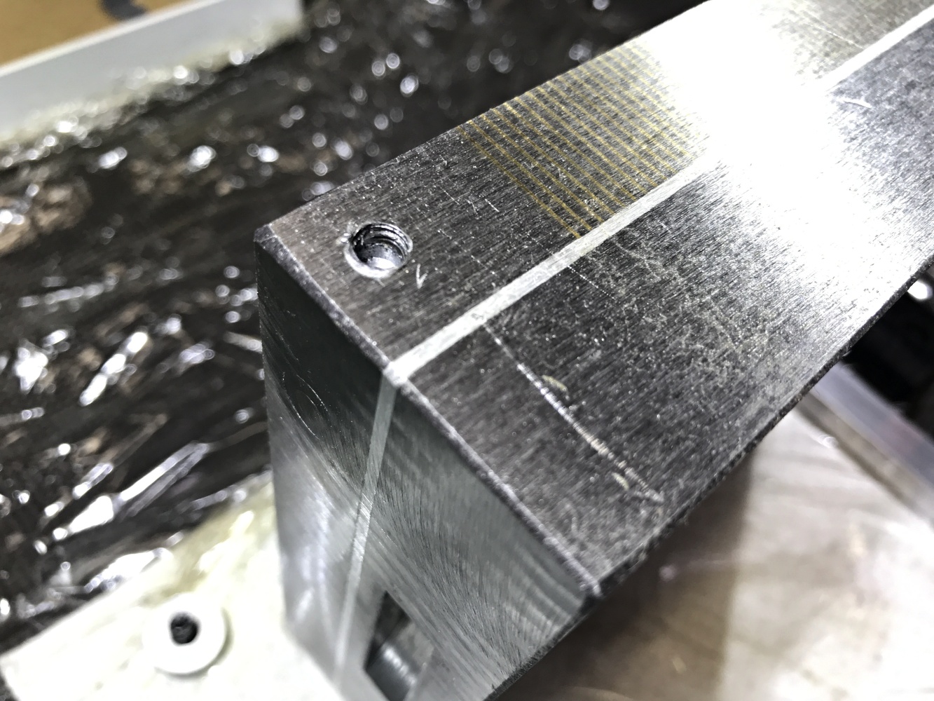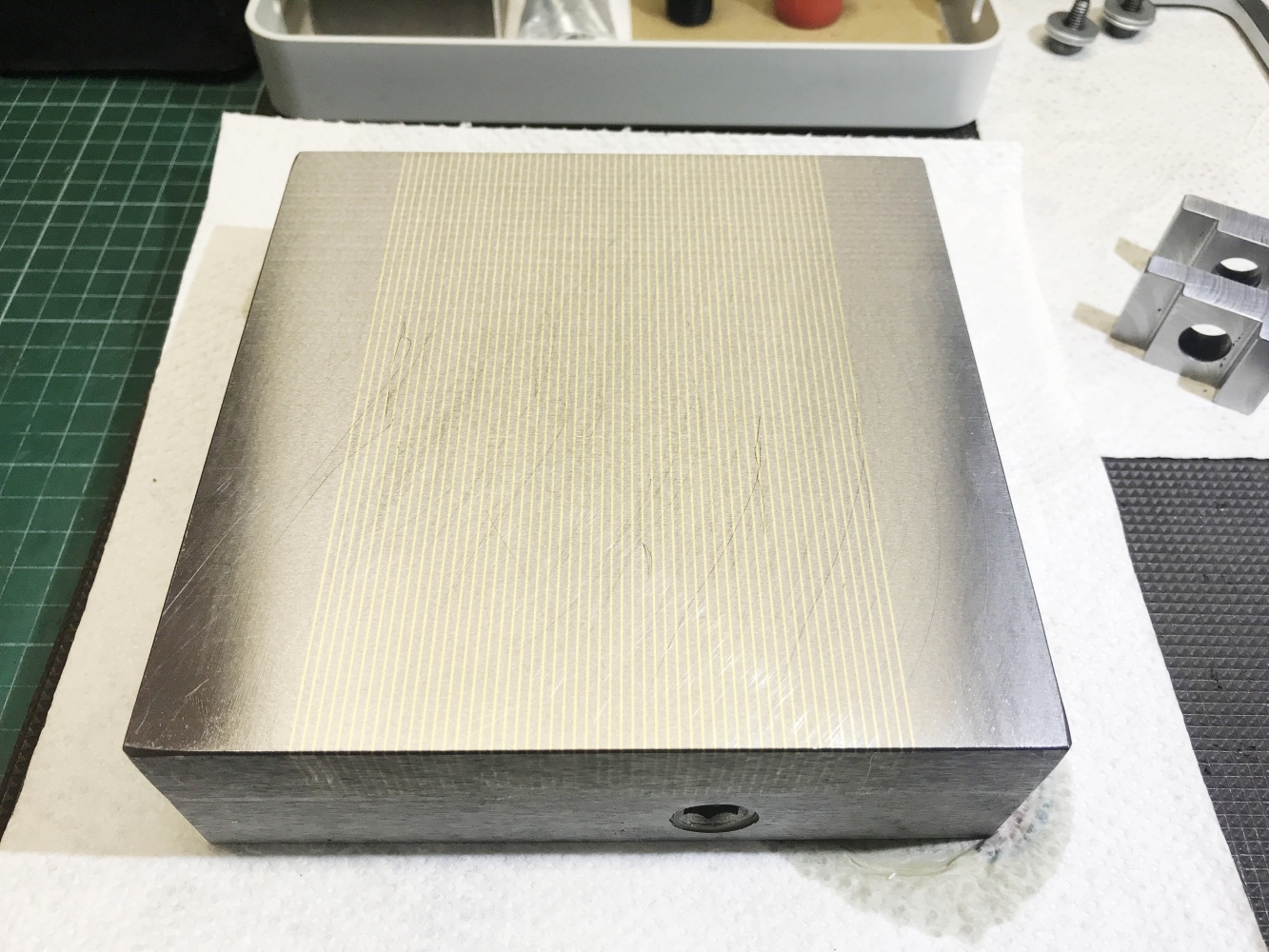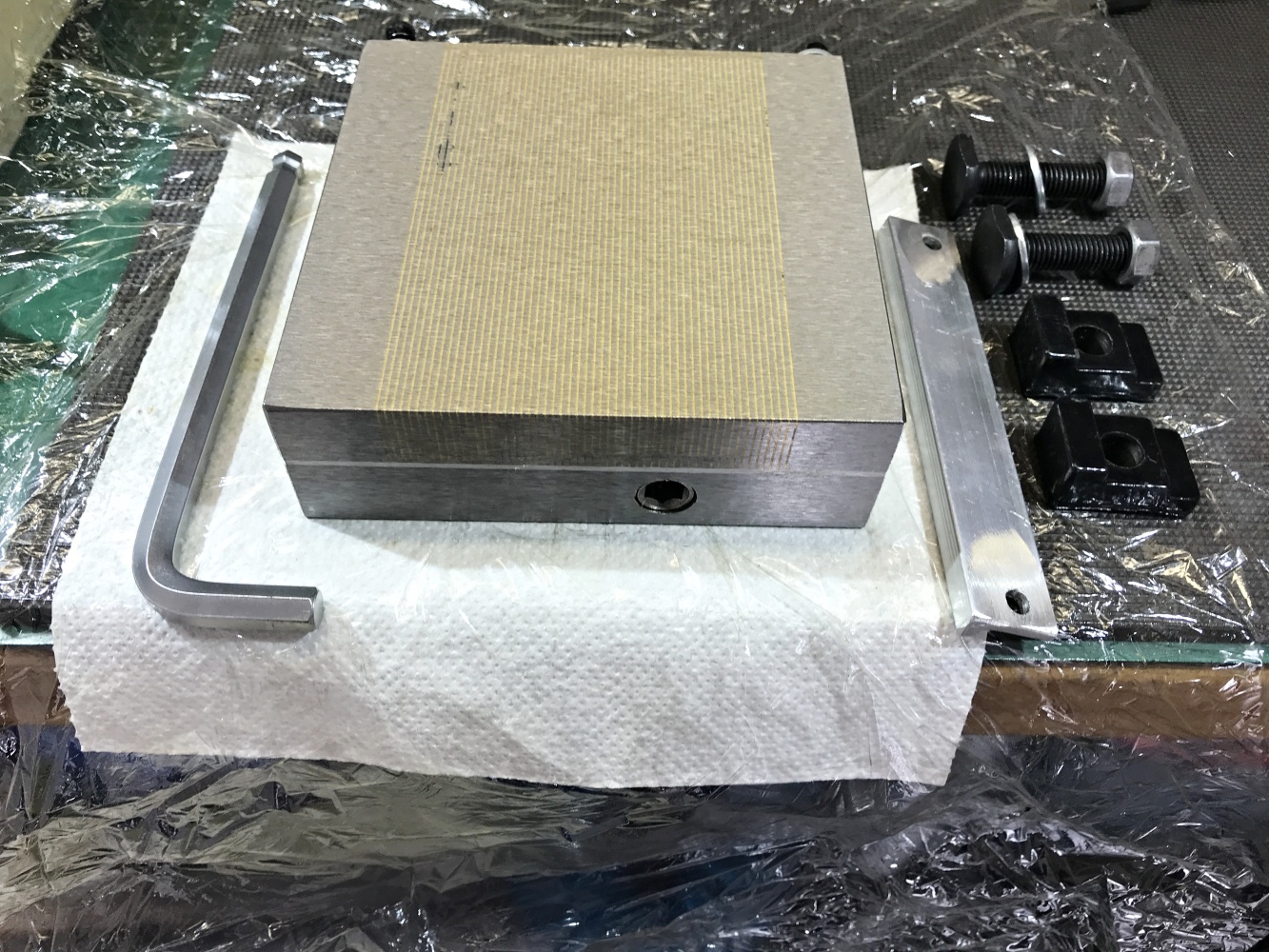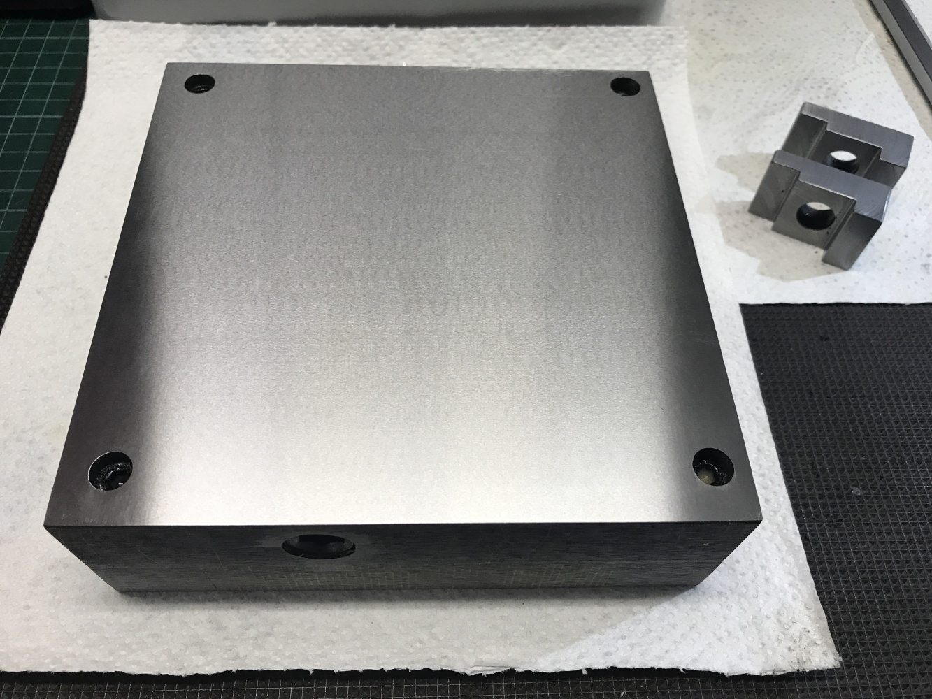 Risknul jsem to a zakoupil přes varování Tumlika čínskou magnetickou podložku. No doufal jsem, že budu mít štěstí a dostanu "podařený kus" - no nestalo se. Dost toho říkají fotky - povrchy děsivé, broušené kdoví čím, závity na šroubky skoro žádné, díry byly hluboké cca 5mm, šroubky jen tak křivě narvané dovnitř, příložka děs: Díry převrtány, vyříznuty závity do hloubky cca 17mm, přefrézovány uchycovací kameny a hlavně díky robokopovi (moc děkuji) přebroušení dolní a horní plochy na magnetce, paralelnost byla mizerná, rozdíl cca 0,25mm, navíc dolní strana břicho a horní strana lavor. Ta kolmost boků mě netrápí, to nejsou funkční plochy a příložka se udělá pořádná. Ty vlasové rejžky na horní straně jsou jen od toho, jak se to posunulo na stole magnetky, to je jen kosmetika. Před úpravami to pořádně nedrželo, dokázal jsem i broušený hranol cca 100x60x30 mm posunout, po přebroušení ani náhodou, vyzkoušeno uchycení menších věcí - ocelové měřítko tl. 0,8 mm lze posunout, profil šíře cca 20mm a výšky 6mm se ani nehne, upínací kámen, viz výše, se ani nehne.