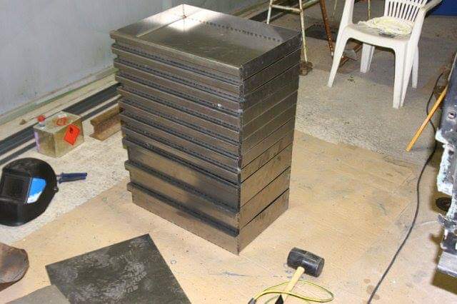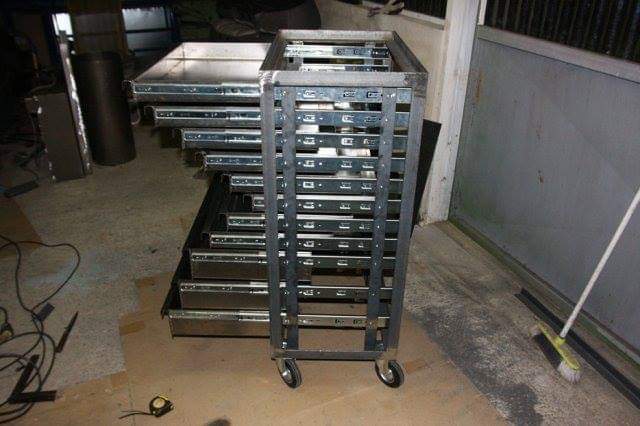 Buď si je naohybáš, prkorina, nebo to někteří řeší tak, že shánějí starý vojenský plechový šuplíky, takový ty těžký perforovaný, na ty se přidělají výsuvy, někdo je rovnou boduje, já jsem spíš zastánce šroubů, a pak na to dodělávám na míru rám okolo.