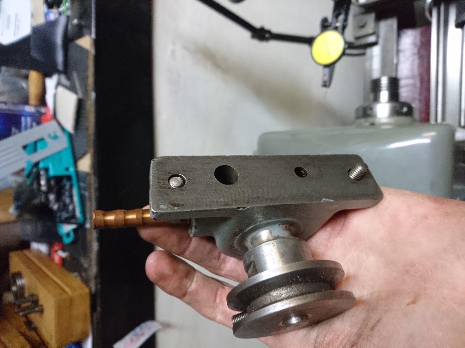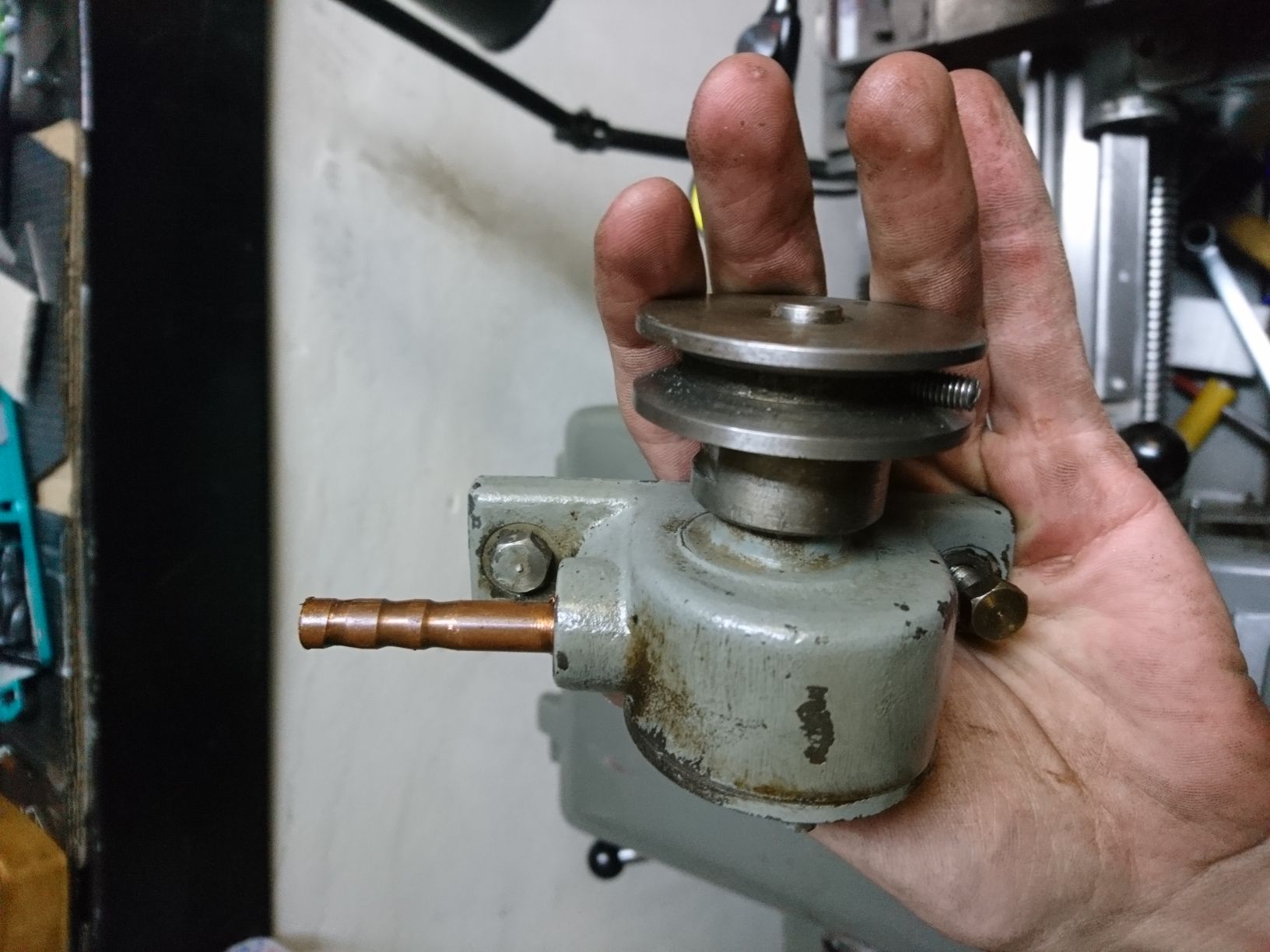 Tady jsou slíbené fotky původního čerpadla (nebo spíš pumpičky) na emulzi, které je jinak přišroubované zezadu podstavce a hnané řemenem zespod od předlohy. To mi přijde dost nepraktické, tak zvažuju že dodělám sólo pohon elektromotorem (mám tu 100W z domácí pekárny tak uvidím jestli to bude stačit) aby se dalo pohodlně zapínat chlazení a nemusel se furt nahazovat a shazovat řemen.