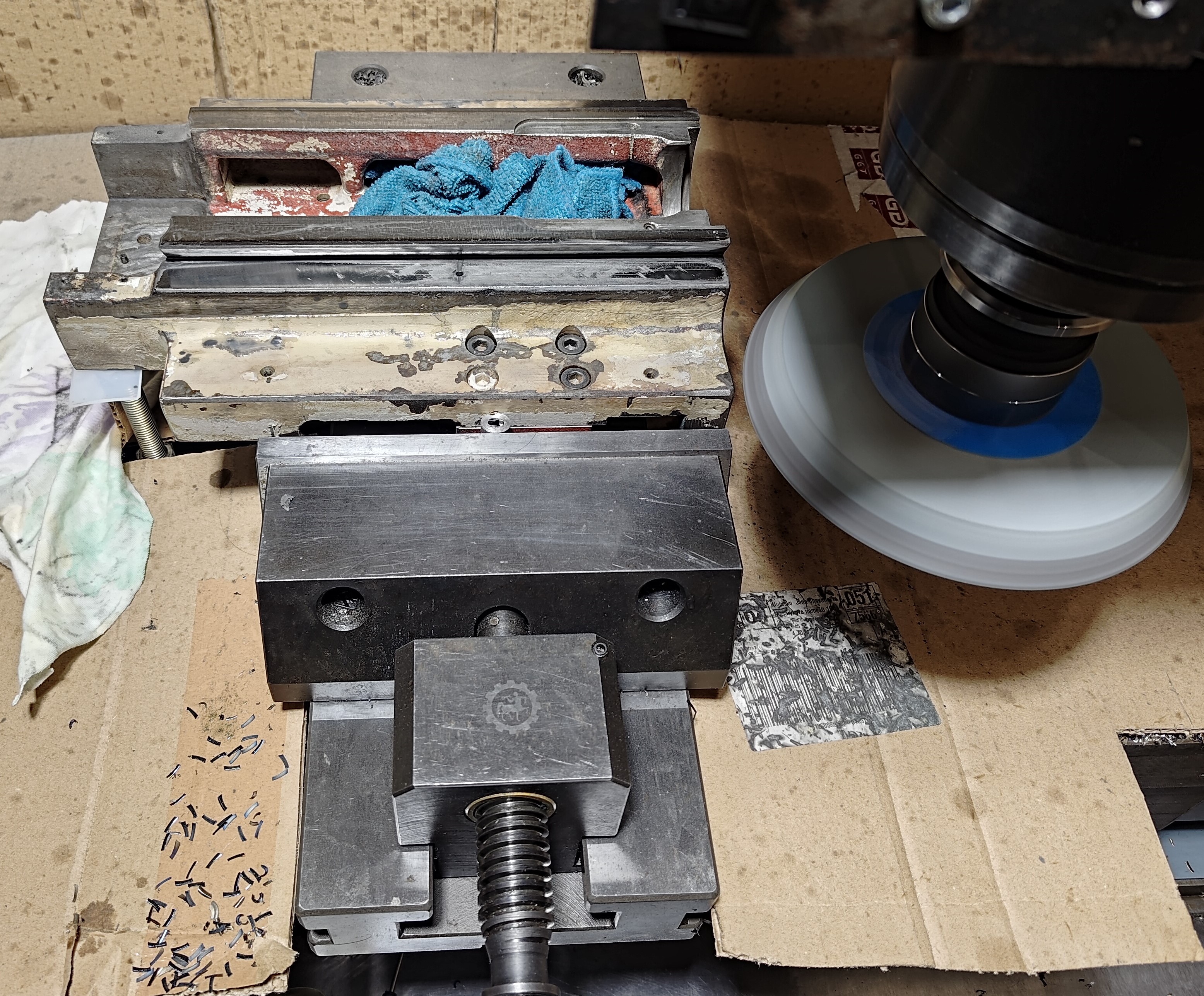 Brousil jsem na mé VMC-850 ale zvolil jsem moc jemný kotouč - 240, zalepoval se a pálil, musel jsem opatrně. příště bych šel asi do 100. Brousil jsem jen lehce tak aby se většina plochy začistila a abych nemusel vyrábět nový klín pro štelování vůle.