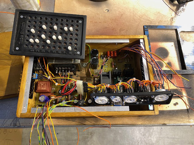 Po kompletní výrobě krabice a předního panelu se mi tam nevešlo trafo. Použitá jiná krabice a po výrobě panelu na elektronkové patice už se mi tam nevešlo nic. Třetí pokus je optimističtější, pro změnu se mi tam nevejdou dva displeje. Nakonec jsem to vyřešil koupí dvou sdružených měřáků.