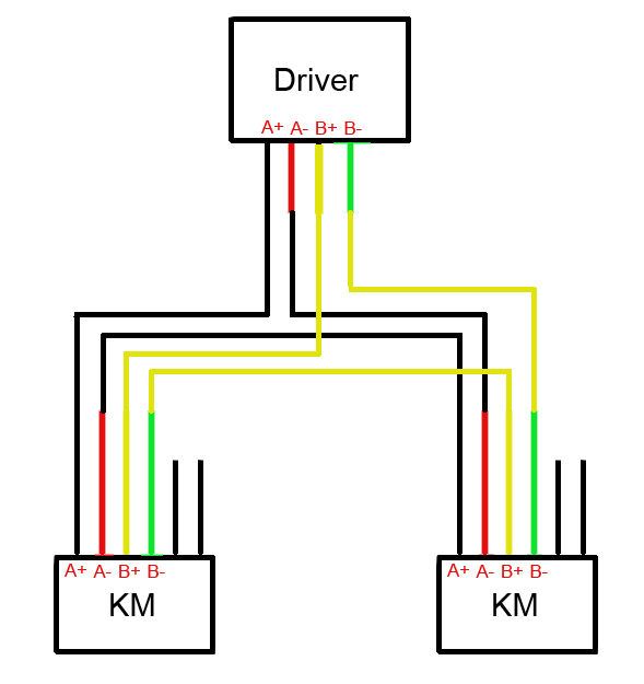 Provozovani dvou motoru na jednom driveru je mozne jen tehdy,je-li spojeni techto dvou motoru velmi tuhe.Nesmi byt mezi nimi dlouhy remen a pod. Jakmile se pohne jeden rotor,driver polohu stabilizuje a pokud jsou rotory spojeny pruzne,regulace se brzy rozpadne a jeden motor vypadne ze synchronismu.Pri opravdu tuhem spojeni to funguje. Elektricky je treba motory spojovat paralelne.Seriove spojeni neumozni vyssi otacky.