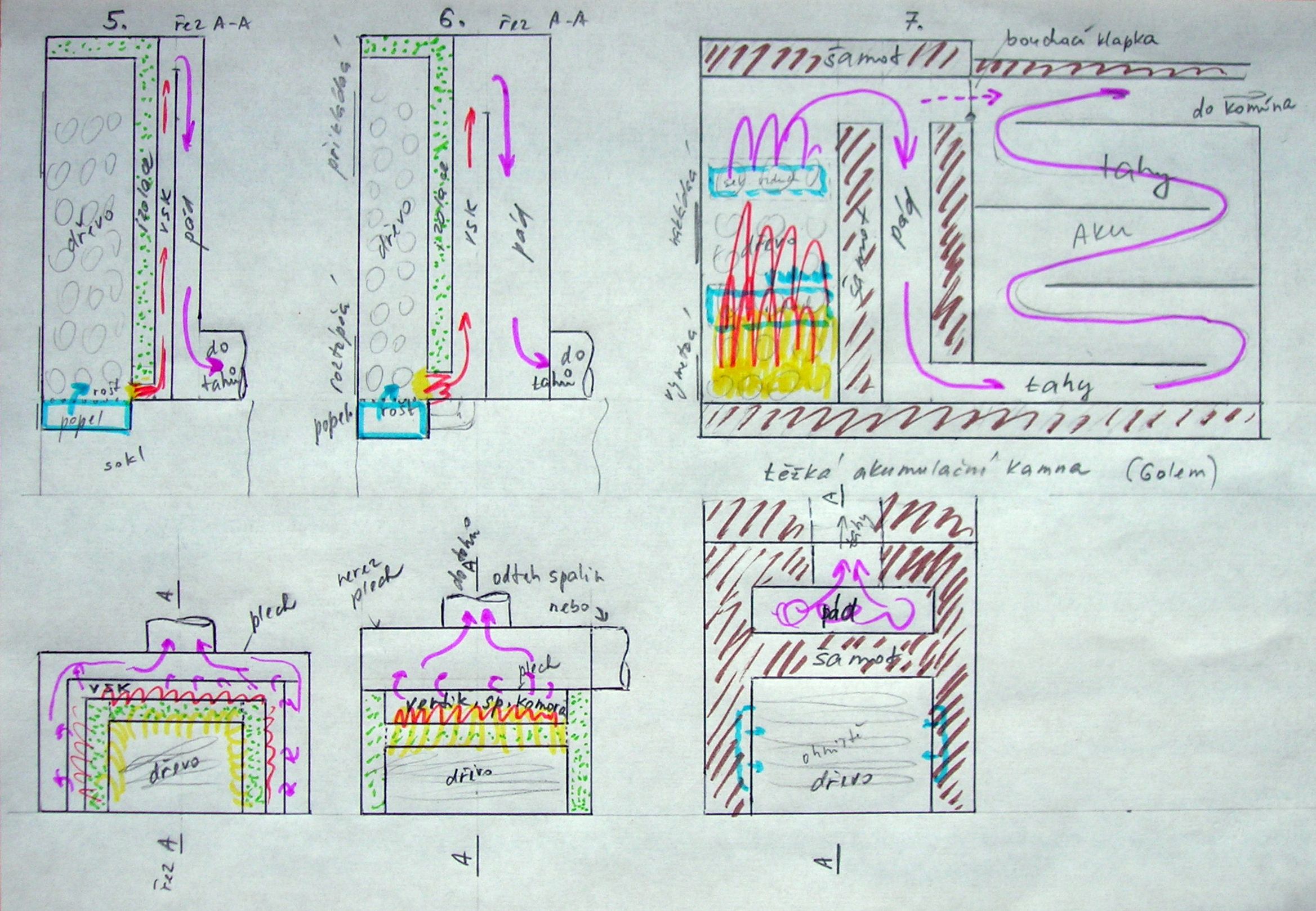 Na obr. 4 je prostor pro přikládání dřeva opatřen izolací, snad, aby se nevznítilo dřív než odhoří spodem. Je možné, že by dřevo teplem zplynovalo a plyn mohl bouchnout. Nevím. Přidaná izolace dále snižuje prostor pro odhořívání dřeva, v přední části a přímo vybízí k přechodu do hranatého tvaru, což by se dalo snadno vyzdít i s dvířky. To bude na dalších obrázcích, které nakreslím. V podstatě dojdu až ke Golemovi s tím, že vertikální komora bude oddělena rovným plátem železa. Klasický Golem vertikální komoru nemá.