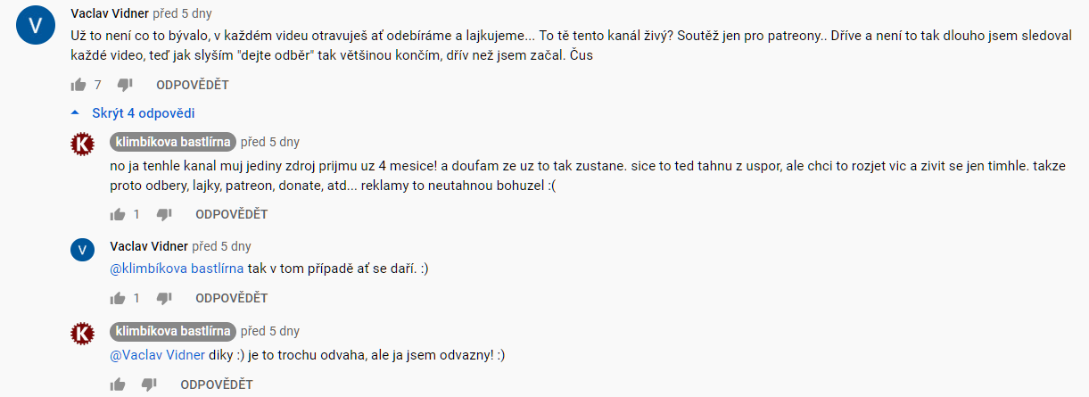 Těch prvních je méně, těch druhých je více a pokud má YT někoho živit (a Klimbík říká, že už asi 4 měsíce žije jen z YT a hodlá v tom pokračovat), tak musí být hlavně sledovanost. Dostal už na prezentaci kozy, doufá, že toho dostane ještě více a zase nejde to bez té sledovanosti, proto ty stálé žádosti o like, odběr videí, sponzoring.