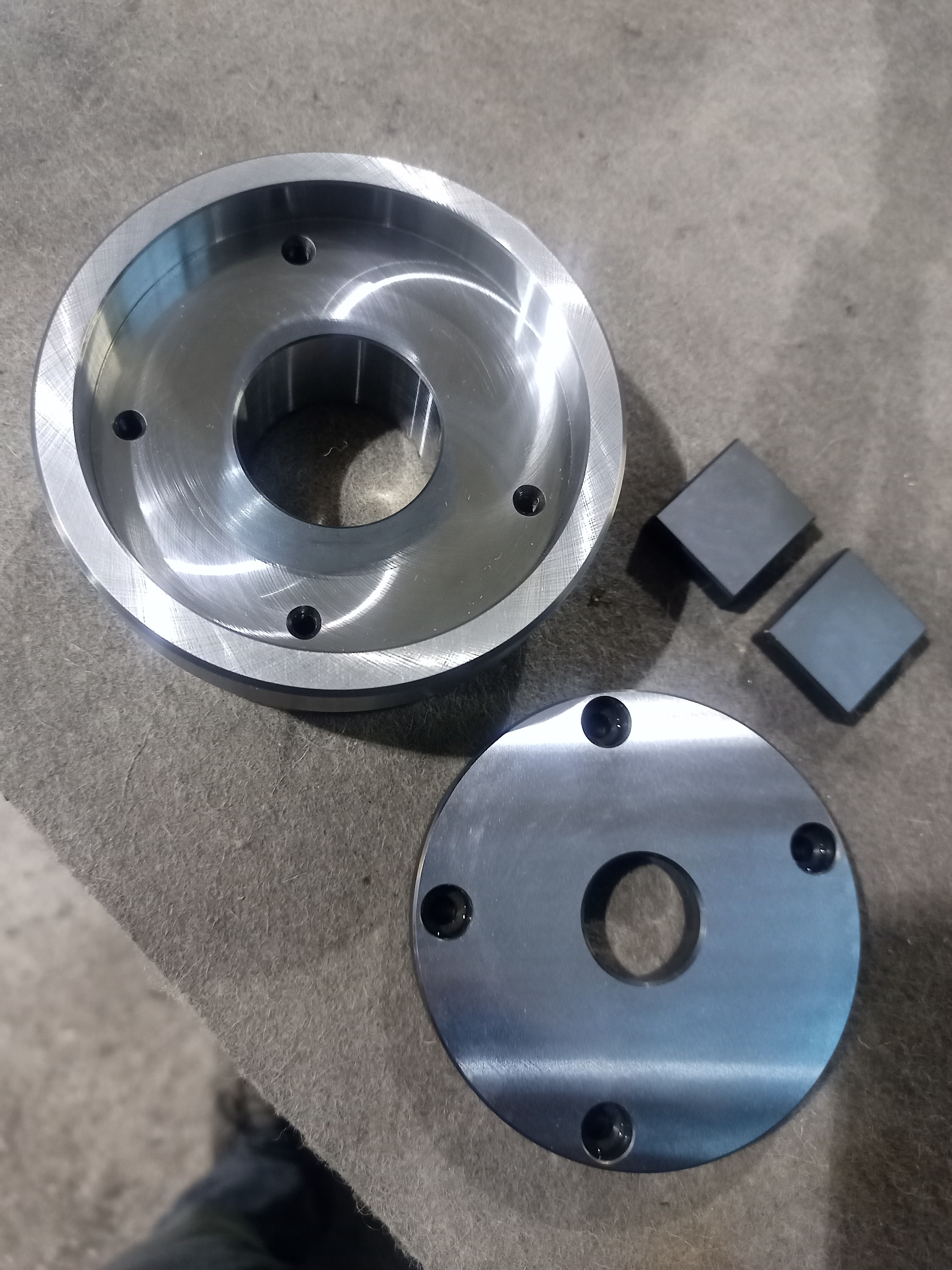 Brúsený upínaci prípravok do CNC sustruhu. Na jedno upnutie obruseny vonkajší priemer, vonkajšie čelo, kruhová kapsa vrátane dna, plus otvor. Rovnobezne plochy dobrusene na magnetke.