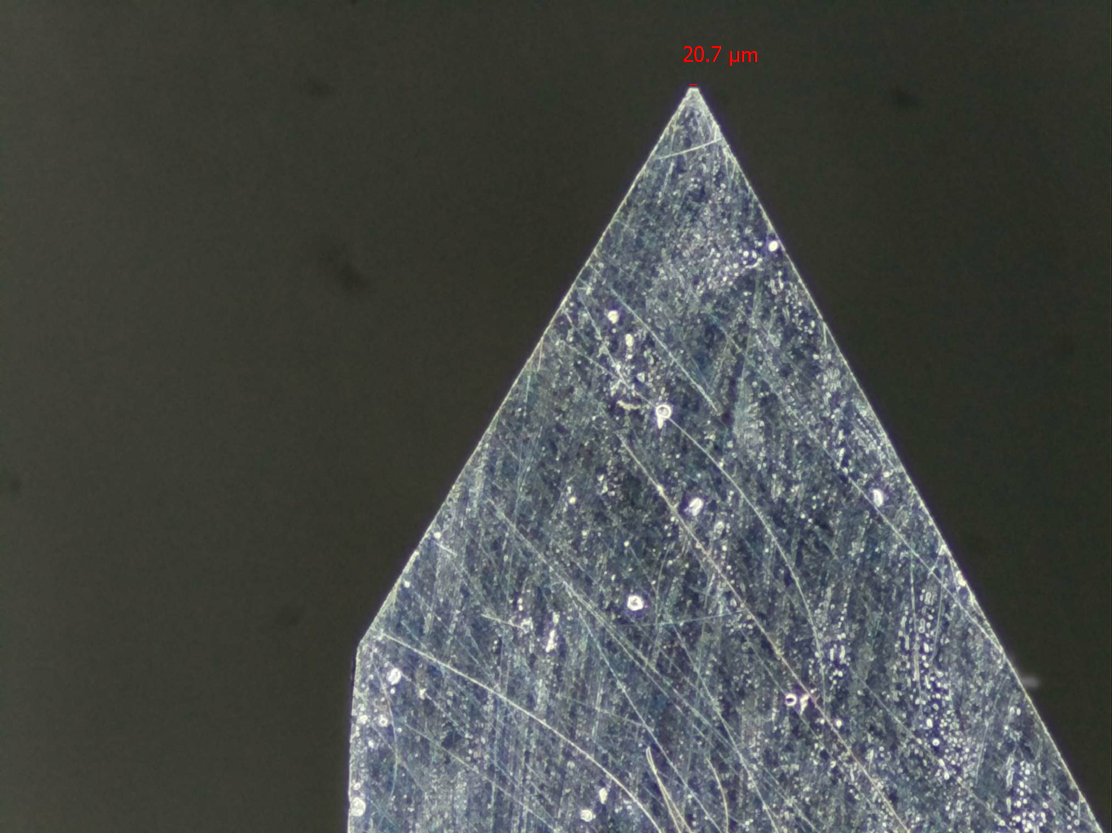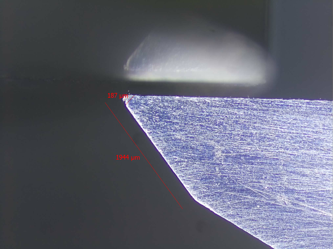 po přebroušení břitů a nabroušení fazety na "hrotu" - to je ta plocha cca 0.02mm, která je tam aby to nebylo totálně do ostra a tak nebylo riziko, že při sebemenším ťukanci při měření, se to naboří a tím to pak vyhřezne zase ven, takže nožíky pak nebudou mít tu rovnou plochu rovnou