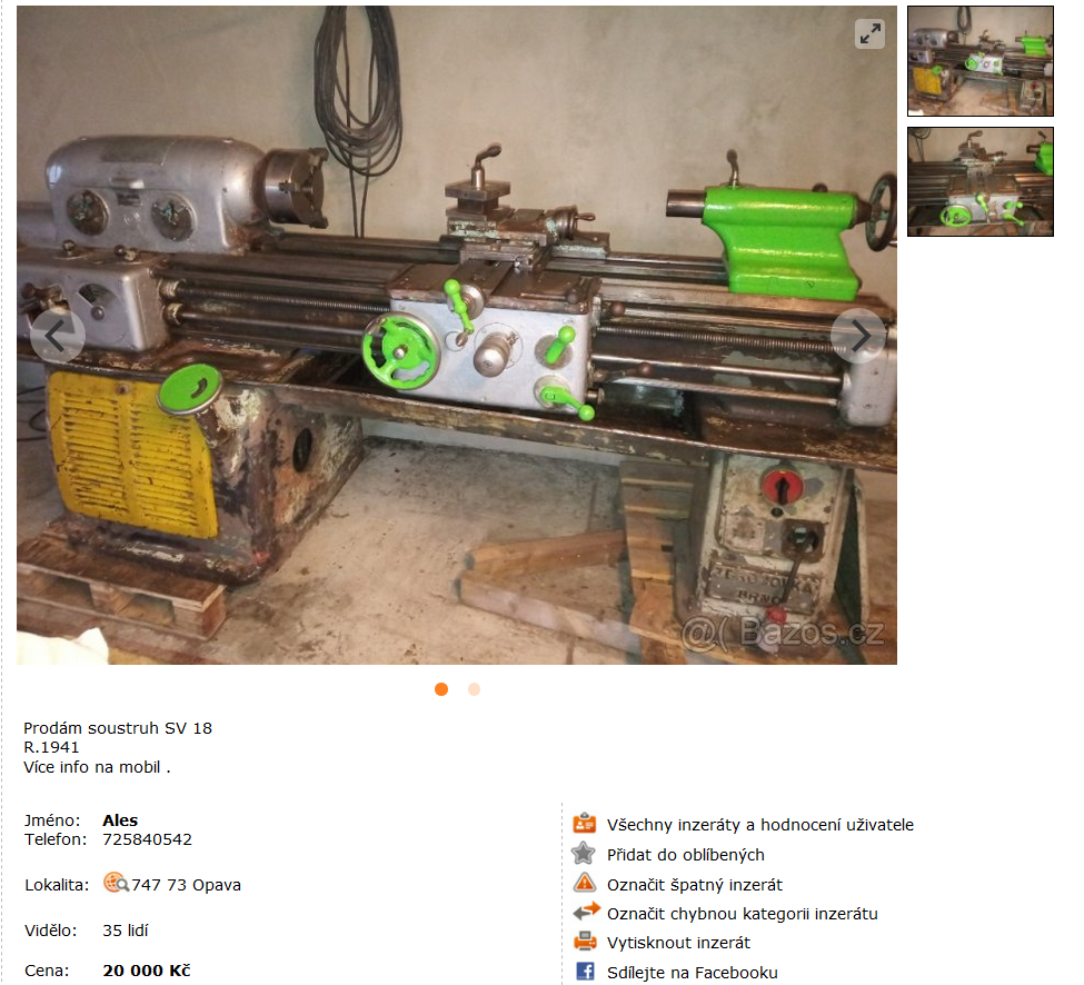 Tak to jsou bohužel normální ceny. Delší dobu koukám po novém soustruhu a to jsou nabídky, že by jeden zvracel. Třeba sjetá SV18RA od překupníka za 6800eur a navíc v Maďarsku. Často pochybuju o inteligenci překupníkůmstreicher píše: ↑13. 5. 2019, 2:31 SU32 za 125 tis. Kc https://www.facebook.com/groups/1411228 ... 5990235280