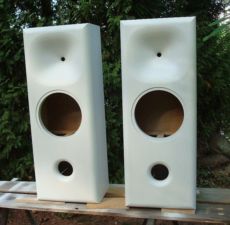 Engineer: První kusy čel jsem dělal pro B&C Speaker DE250 + Sica 12SR3PL, ale zkoušelo se s tím i pár dalších tlakových driverů (DE502, CDX1-1745, CD60.N92). To na fotce je zkušební pár beden ve kterých se bude zkoušet Dayton DSA315-8. Celé je to 1100x420x290mm velké, takže docela dospělá dvoupásmová bedýnka.