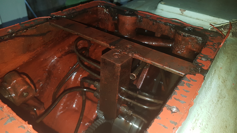 Když tak koukám na tu Tvojí fotku tak rozvod oleje k ložiskům vřetene funguje obráceně než u mne. Olej se přivádí dvěma trubičkami přímo do do těch kapes nad ložisky a přes sítka pak stéká k ložiskům, zbytek přeteče do toho plechového žlábku odkud pak přetéká na převody. Prošťouchnout trubičky by šlo asi i strunou do sekačky. Já jsem některé kratší dělal drátem z C-očka
