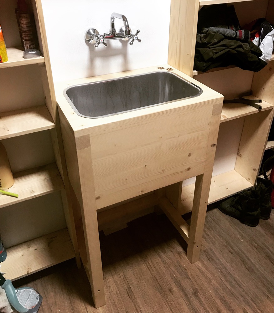 No sice jsem to dokoncil uz vcera, ale nemel jsem uz silu na forum :) drez do technicke mistnosti, na plneni a vylivani kybliku apod. Je to koupeny nerezovy vylisek urceny pro vevareni do stolu, rozmery 50x30x30cm. A ja jsem udelal stolecek, kam jsem ho posadil, zasilikonoval a jeste zespodu vypenoval, abych zajistil tlumeni zvuku kdyz treba tece voda do holeho plechu. Drevo natreno voskem Remmers a stena syntetickou lesklou barvou, tak jak se to dela v americe :) cele vpasovano do regalu taky vlastni vyroby, taky ze smrku.