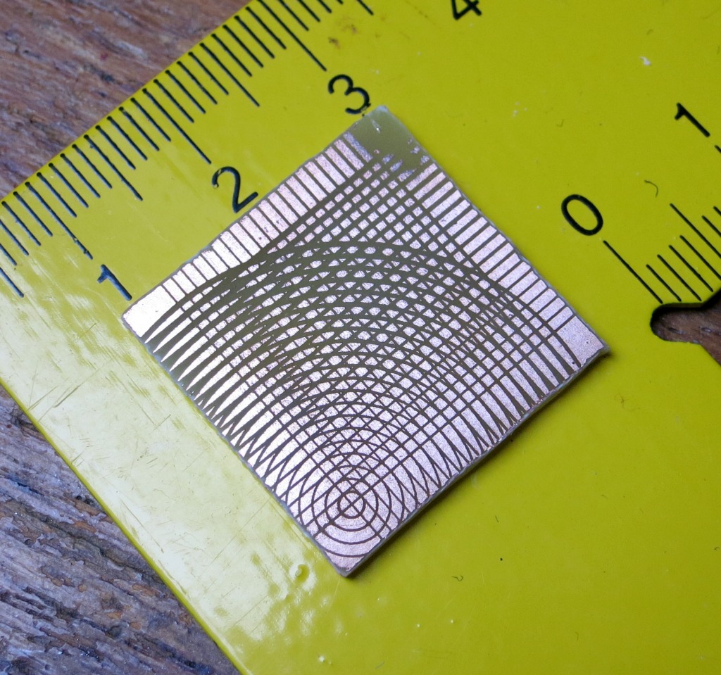 Jinak, při trochu střízlivějším pohledu (mých škodolibých kolegů, co tomu jinak prd rozuměj, znáte to.. ;)) je tam taková lehká roztřesenost a zubatost, je možné, že se klepal laser (byl jen provizorně vražen do držáku na podstatně větší průměr a utěsněn měkkou gumou - viz. účtenkové video) a taky může mít vliv, že jsem to poměrně dlouho leptal (použil jsem dost jetej roztok), takže to možná bude časem ještě lepší.