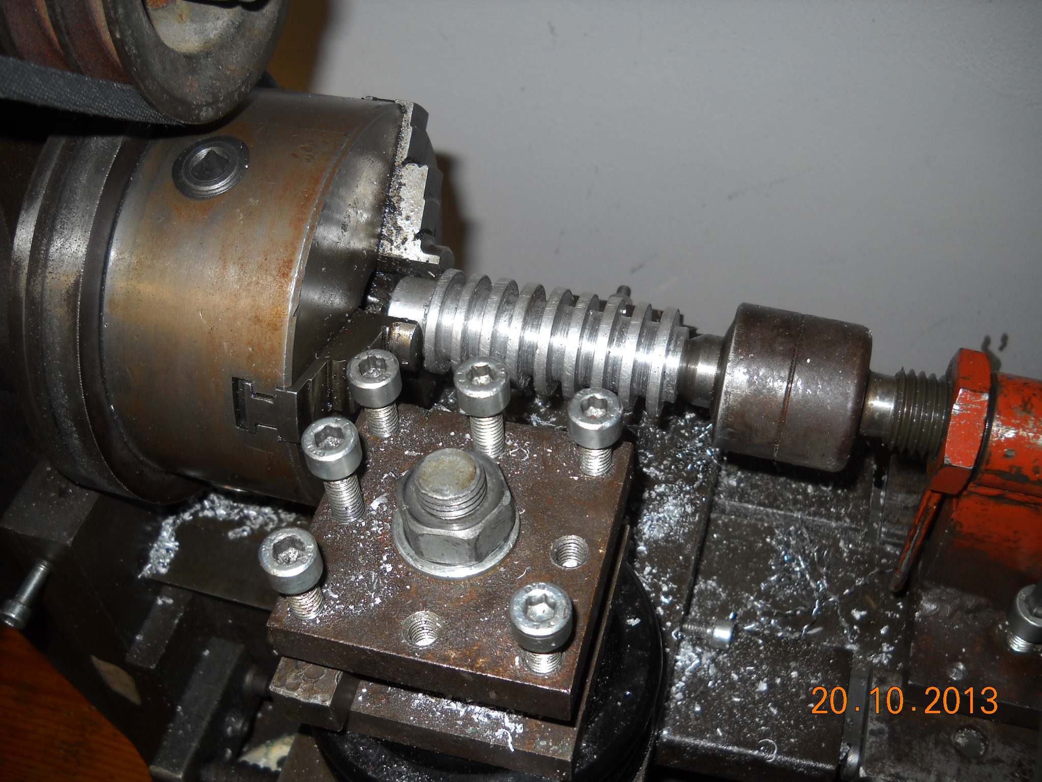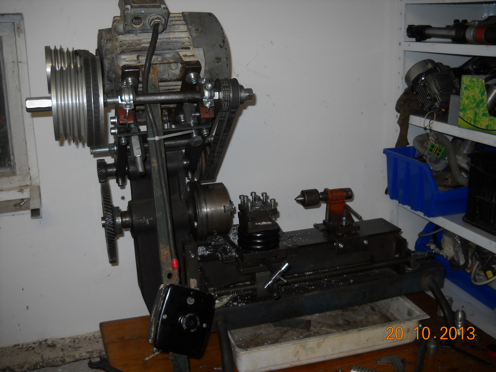 Velké zvěrstvo je pohon. Ten otvor nad vřetenem je pro tyč, která má být konzolou pro frézování kotoučovou frézou. To neplánuji (řekněme zatím) a tak jsem tu díru využil jako předlohu - zejména proto, že to sedlo na rozteč tomu velkému ozubenému soukolí (téměř, asi o 1mm je to volnější, ale protočení zdaleka nehrozí, jen to trochu zvoní). Ještě není hotový stojan, musím vymyslet, v jaké poloze to bude. Prozatím je to jen podepřené. Hřídele jsou závitovky nacpané v trubkách a uložené v ložiskách. Nyní, když už to umí, bude mít soustruh šanci vyrobit si hřídele lepší a finální. Také napínání řemenů bude ještě vylepšováno. Motor se houpe proti vřeteníku a vytváří tak protiváhu. Jednou v budoucnu tak bude možné dodělat i plánovanou funkci frézování.