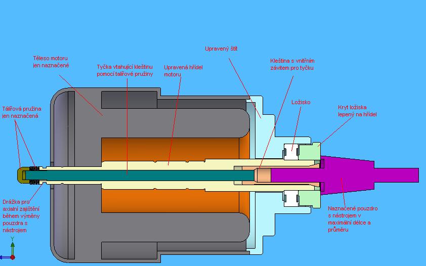 Znovu bych chtěl oživit téma vřeteno ATAS a prosím o názory. Chtěl bych se pustit do úpravy vřetene na automatickou výměnu nástrojů asi takto. Jen pro vysvětlení - talířků v pružině by mělo být asi o dost víc a kleština je jen taková virtuální. Kdyby někdo znal nabo věděl kde se nachází taková nějaká kleština, která má vnitřní průměr 8 až 10 mm; závit pro vtažení M5 nebo M6; vnější průměr 11 až 14 mm a délku asi 50 mm, tak dejte vědět.