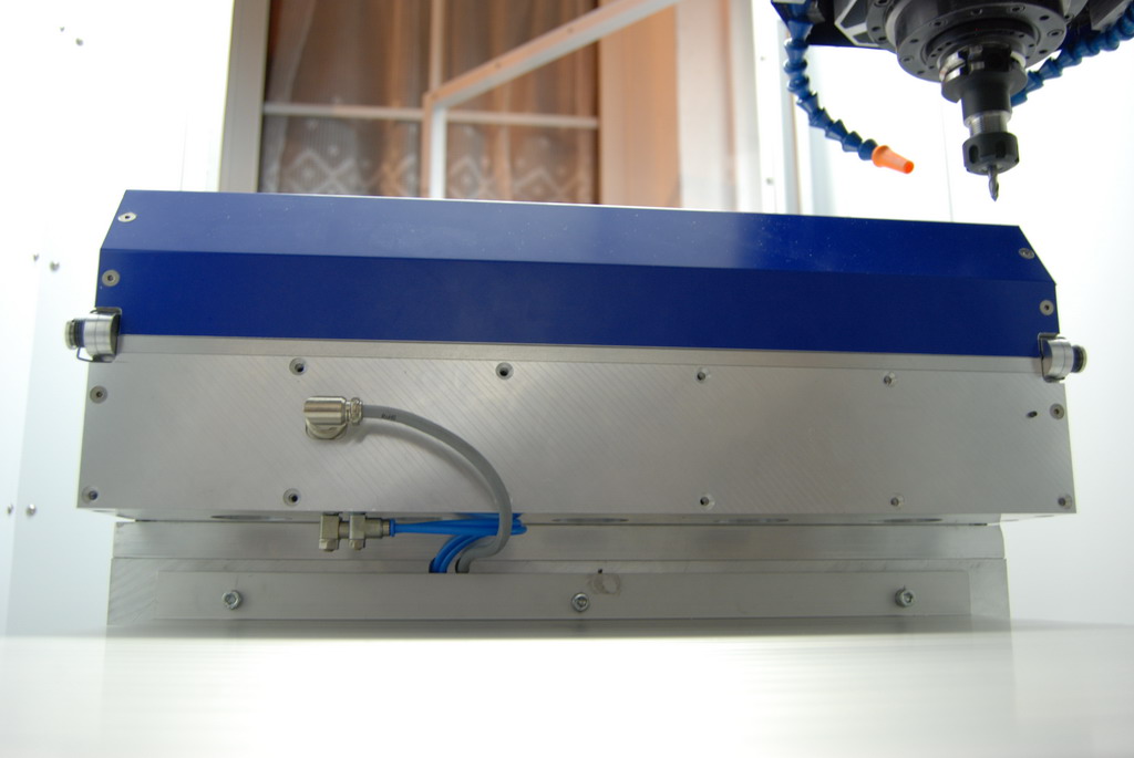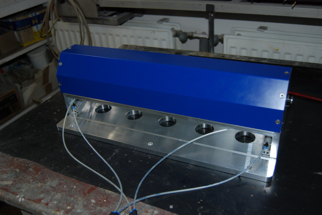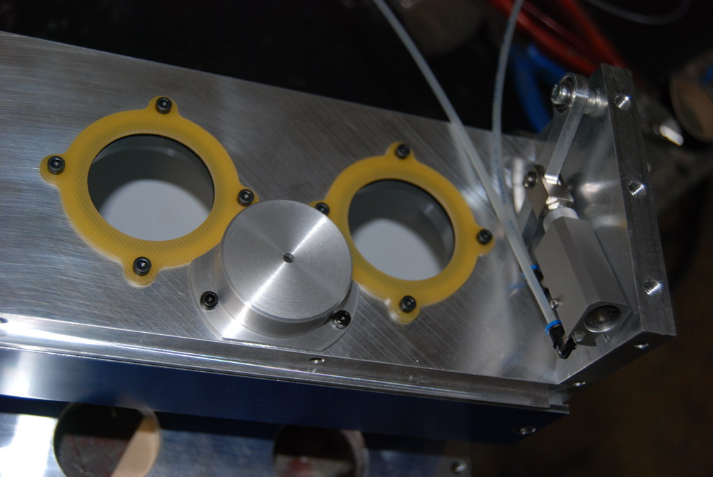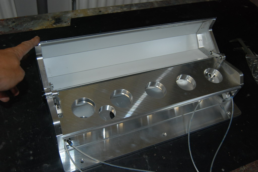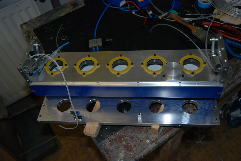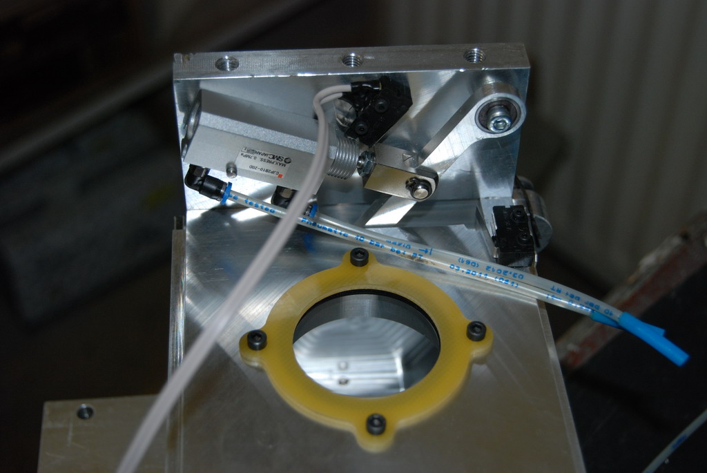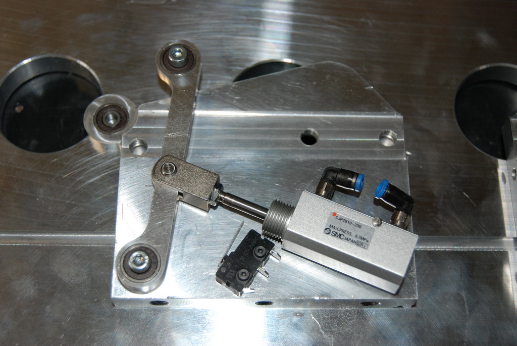 A teď se to všechno musí ošetřit tak, aby to navazovalo a hlavně ošetřit různé stavy a situace, které můžou nastat. Taky systém musí vědět, který nástroj má kde a jeho délku. Samozřejmostí je přesné změření polohy jednotlivých nástrojů po upevnění výměníku na stůl. Výměník je vyfrézován z desek od Alcomu. Pod každým nástrojem je odpružení s O kroužkem - aby nedopadal kov na kov. Otvírání krytu je vyřešeno přepákováním a dvojčinými písty SMC. To ovšem nestačilo, takže víku ještě pomáhají zkrutné pružiny a aby víko při otevřeni "nemlátilo" je tam ještě jedna pružina, která slouží jako tlumič.