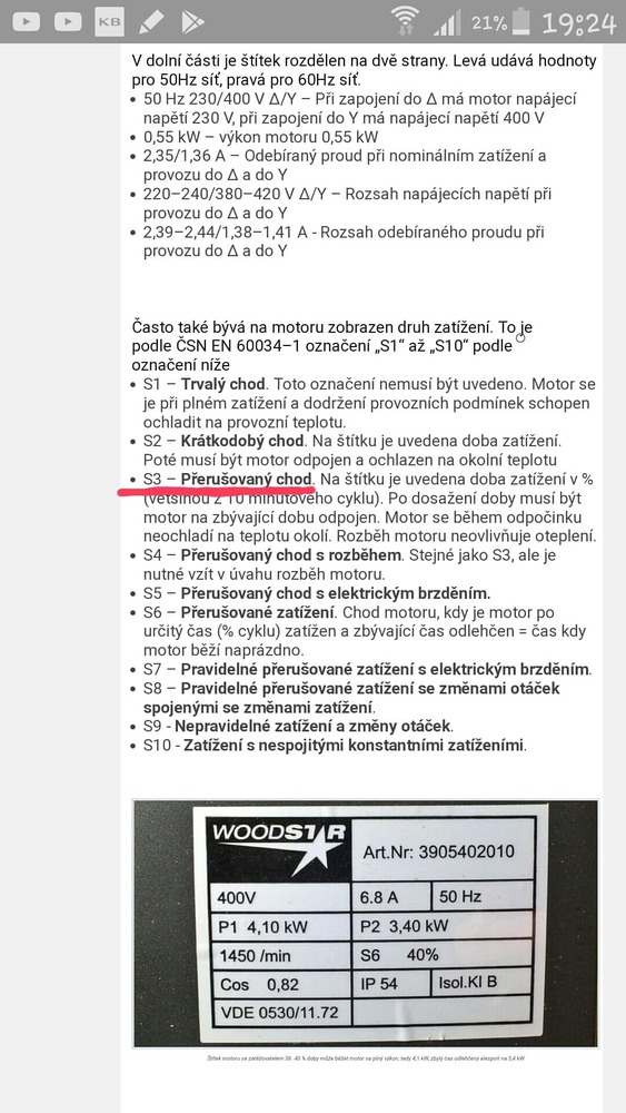 Možnátěm znalým, kteří většinou mlčí, nebo mlží to nepomůže ... ale pro všechny, kteří budou někdy vybírat motor může být tabulka v příloze užitečná. Je na ní rozdělení motorů a ten můj spadá do kategorie S3, což jsem nevěděl. Procenta 60-40-40% značí dobu běhu v desetiminutovém cyklu. Tedy můj motor může běžet 6-4-4minuty a zbytek času v desetiminutovém cyklu by měl stát.