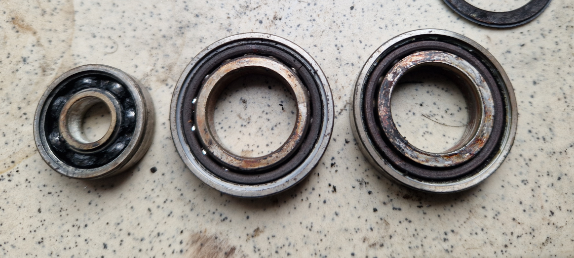 Všude jsem nechal originál vazelínu. Po dvou letech provozu se ty L&Y začaly ozývat a tak jsem oba motory rozebral. Přestože používáme demineralizovanou vodu je na nich solidní vrstva sanytru. Motory jsou naležato. Při povolování předního labyrintu se mi podařilo u jednoho motoru utrhnout kotvu od hřídele. Ložiska vypadají všechna skoro stejně. Zbytky vazelíny degradované na něco podobné tvrdému parafínu. Vpravo je to L&Y vprostřed FAG a vlevo zadní SKF.