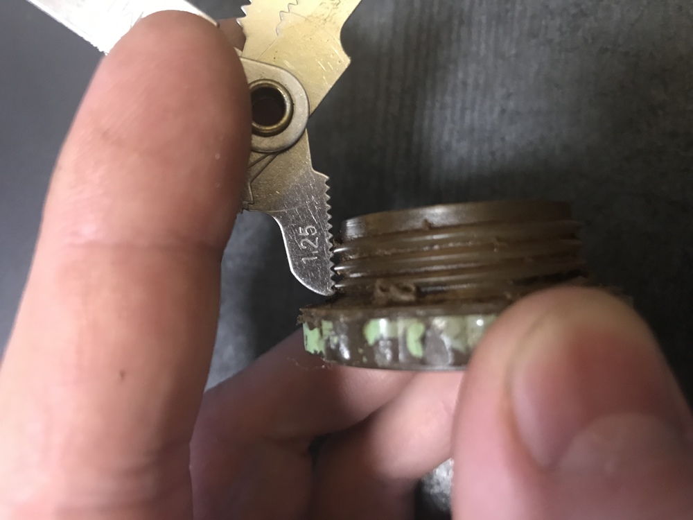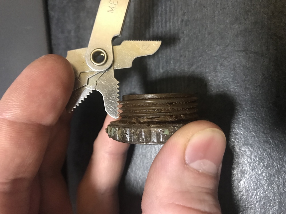 Jo mam. Ale jsou male. Nejpodobnejsi je tomu 1,25 x 2, a jde videt, ze zavit na olejoznaku je jeste o trochu hustsi. Takze by mohl mit to stoupani 2,3, co ma prave G1”. A vnejsi prumer zhruba 32,5mm, a g1” ma mit nejak 33mm. Tak asi to ma ME a MF jine ty olejoznaky. Na prevodovce stolu mi to zase prijde jako G3/4”