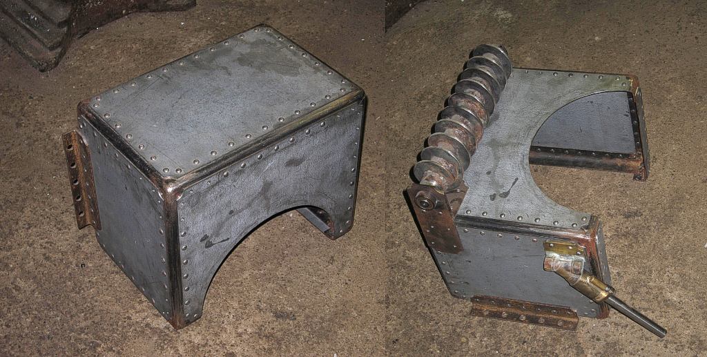 Přinýtuji na ní ještě plunžrové čerpadlo a šnek na zatáčení a vlastní nádrž zpájím zřejmě z pozinkovaného plechu nebo mědi a strčím jí dovnitř.