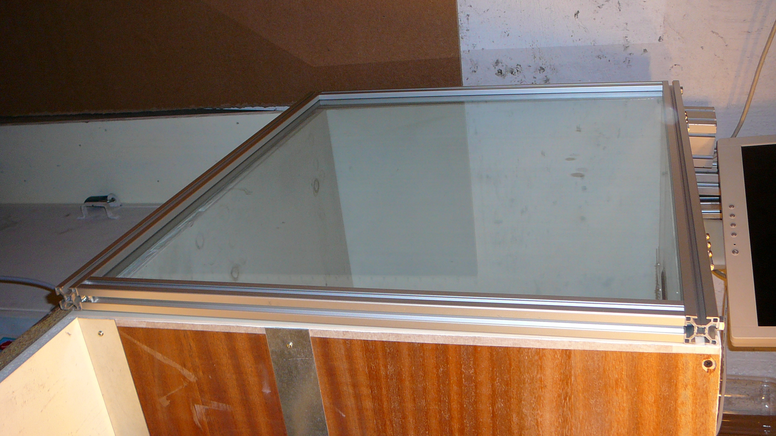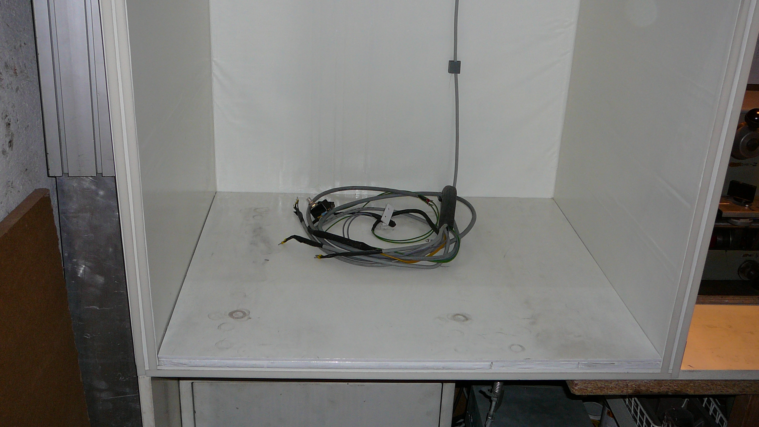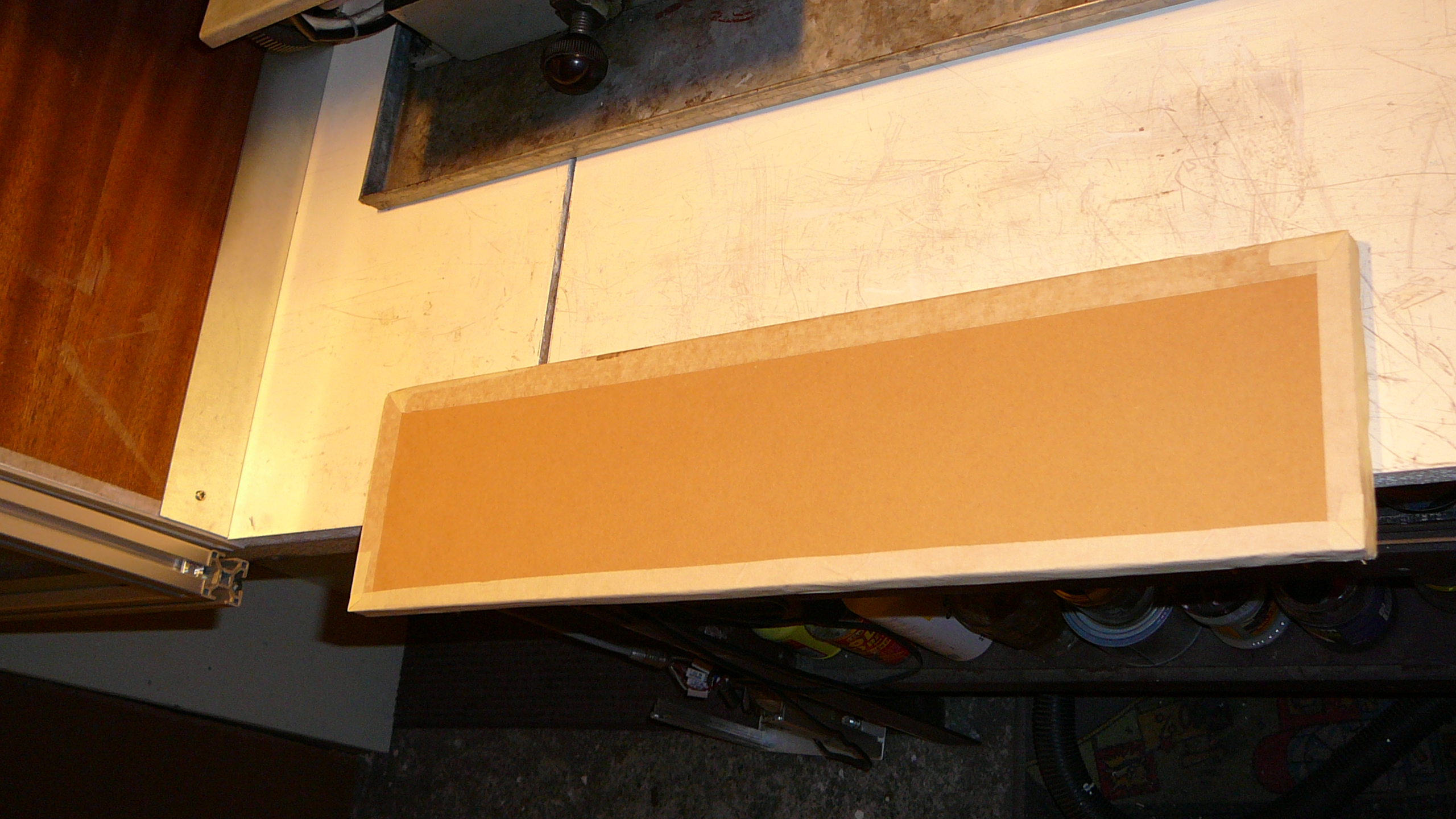 Konečně jsem se dostal k těm fotkám izolační protihlukové bedny okolo budoucí mašinky, kterou předělávám. Zvenčí mám obyčejnou laťovku 18mm a uvnitř desky Wolf Phonestar 12mm. Jak už jsem psal, jsou nalepeny chemoprenem a zatím to drží, i když ty desky jsou vlastně obyčejný papír s komůrkami naplněné křemičitým pískem. Existují i tlustější a nebo se i na sebe lepí třeba dvě desky pro větší tlumení, ale to hlavně používají zvuková studia. Bedna není nic moc extra a pro použití chlazení kapalinou při frézování uvažuji o obložení stěn plechem, aby se papír nerozmočil. Jenže musím tyto úpravy částečně odložit až po vložení nové mašinky, protože jí do bedny budu stěhovat pravou boční stěnou, která navazuje na ponk v dílně, kde jí sestavuji. Zatím fréma frézky má hmotnost 170 kg a po dokončení to bude cca 250 kg.
