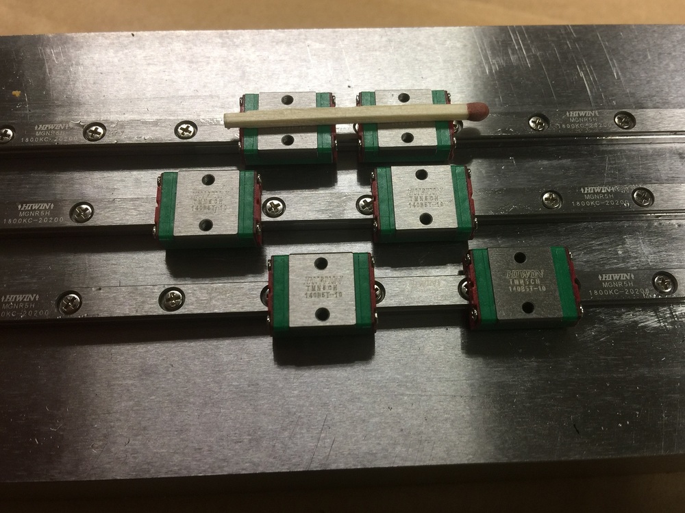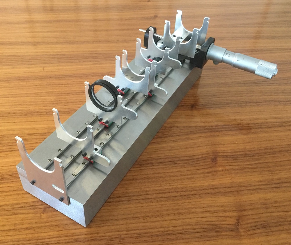 Miniaturní optická lavice, postavená na těch nejmenších lineárech jaké se mi podařilo sehnat (fotka s oblíbenou sirkou přiložena). Na rozdíl od klasické lavice s prizmatickým nosníkem se tady dá dojet s čočkami prakticky na dotek těsně k sobě, což odpovídá zaměření hlavně pro vývoj a ladění okulárů.