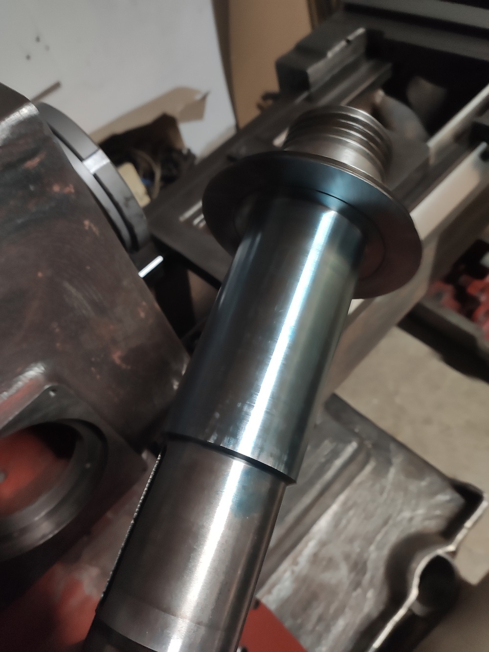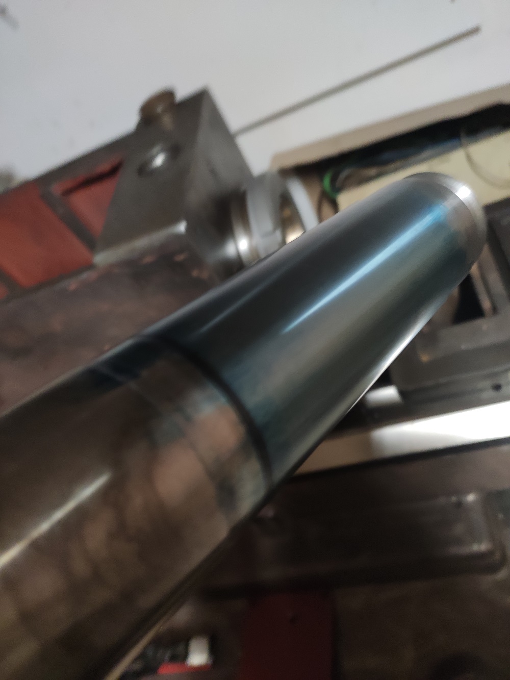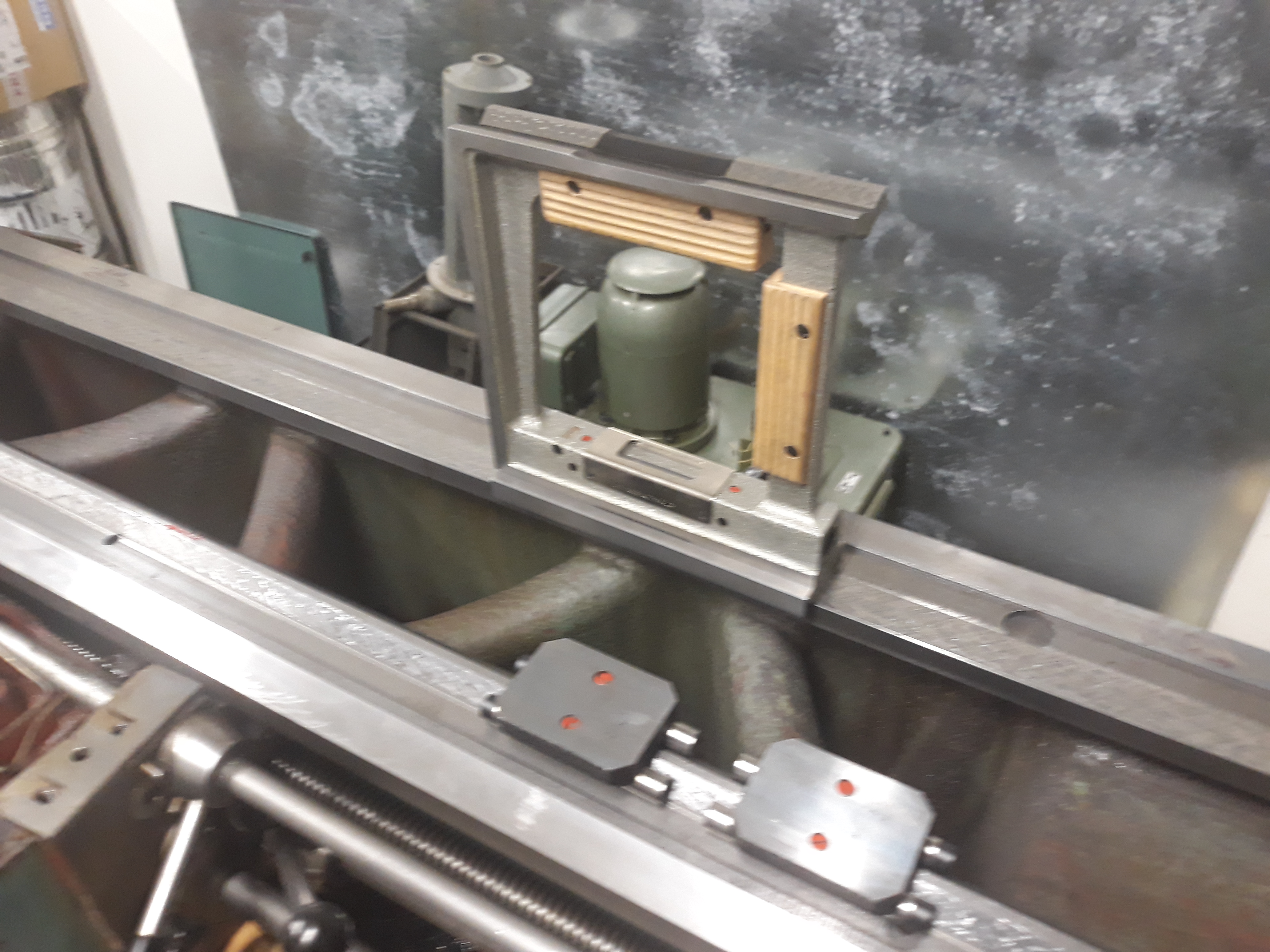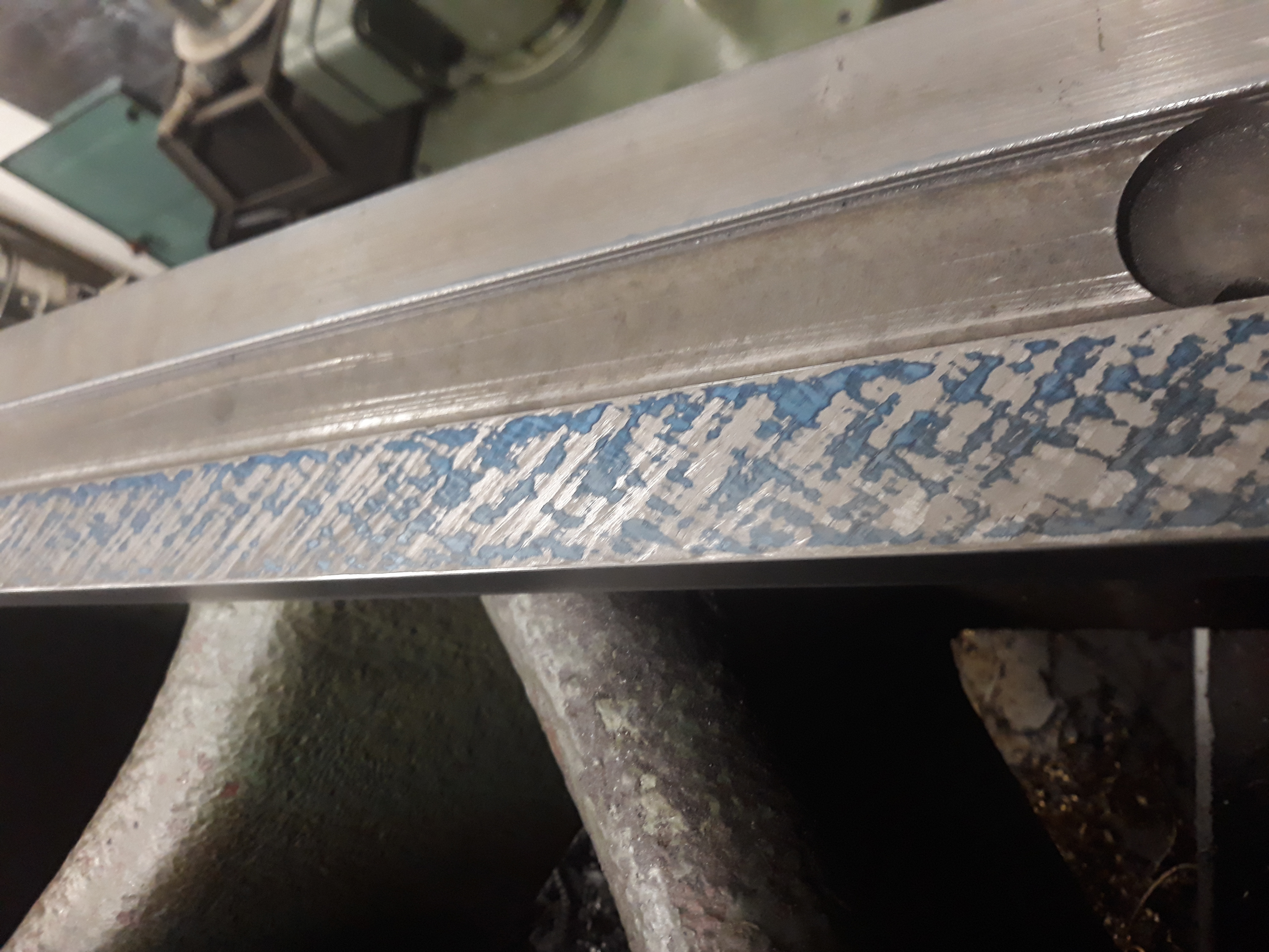 Po dlouhé době jsem se konečně dostal k soustruhu. Opsal jsem vřeteno do ložisek a lože na koníka. Dělal jsem to poprvé, možná podruhé, s olejovou barvou od Umton (pruská modř), ale minimálně to vřeteno vypadá opsané docela slušně. Co říkáte na: