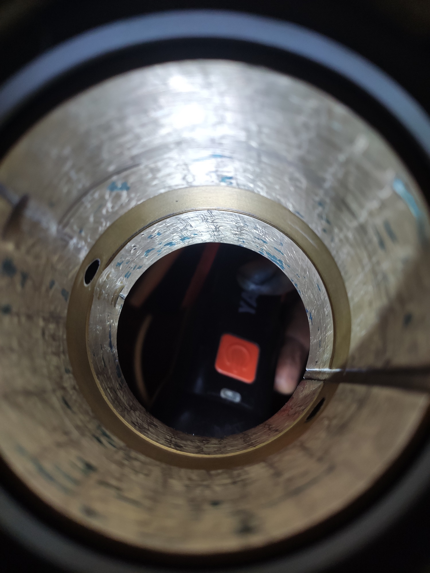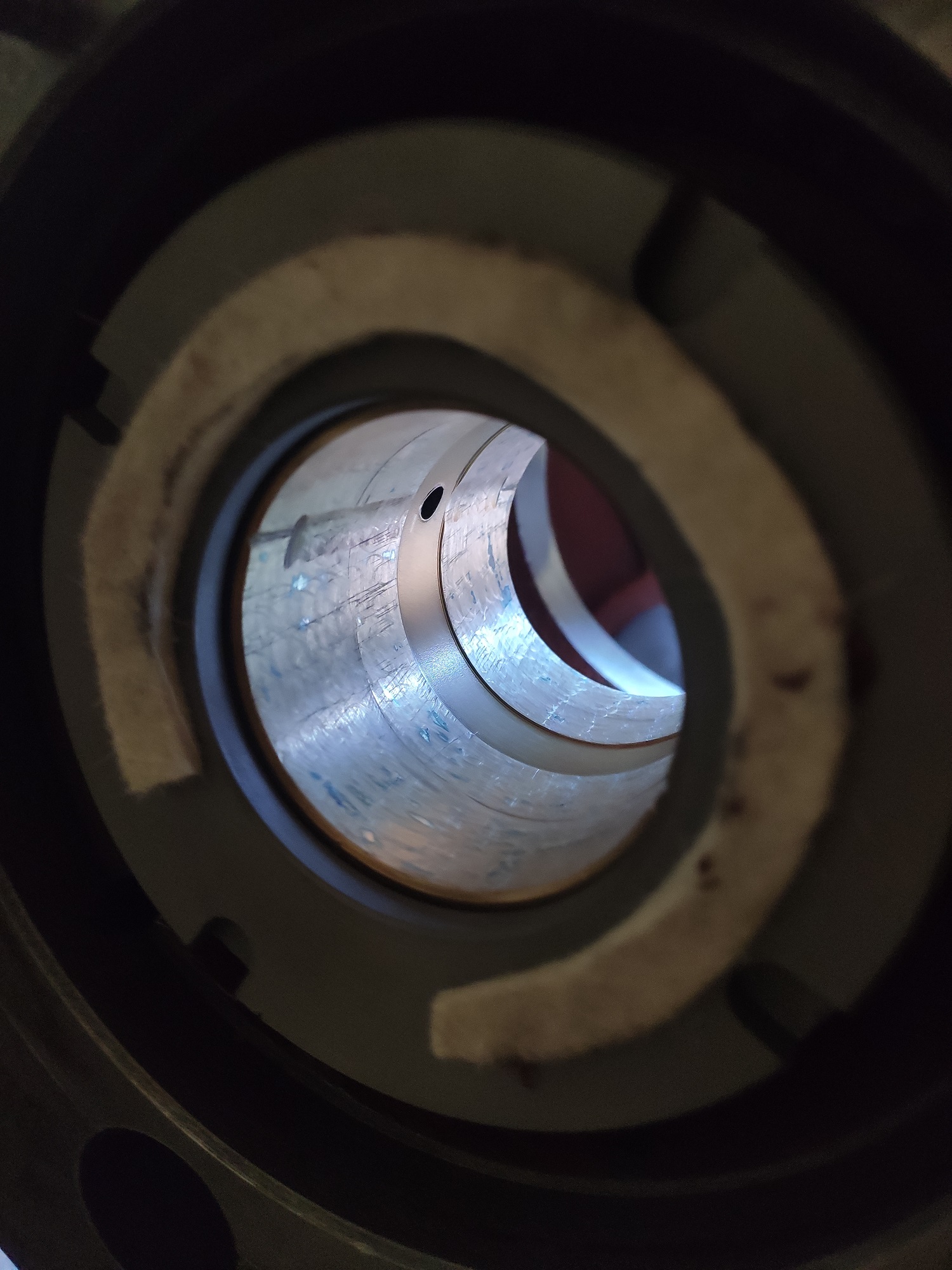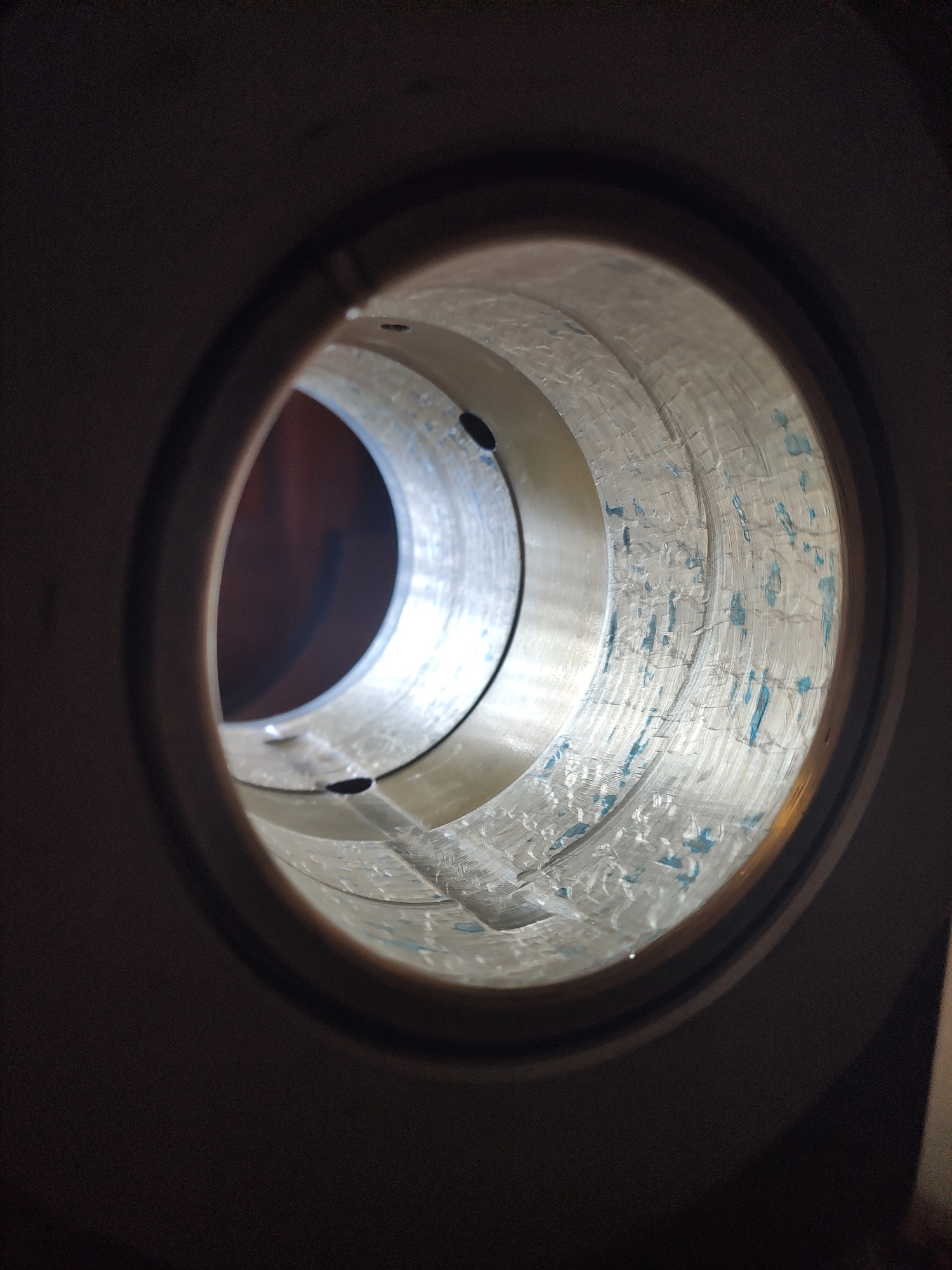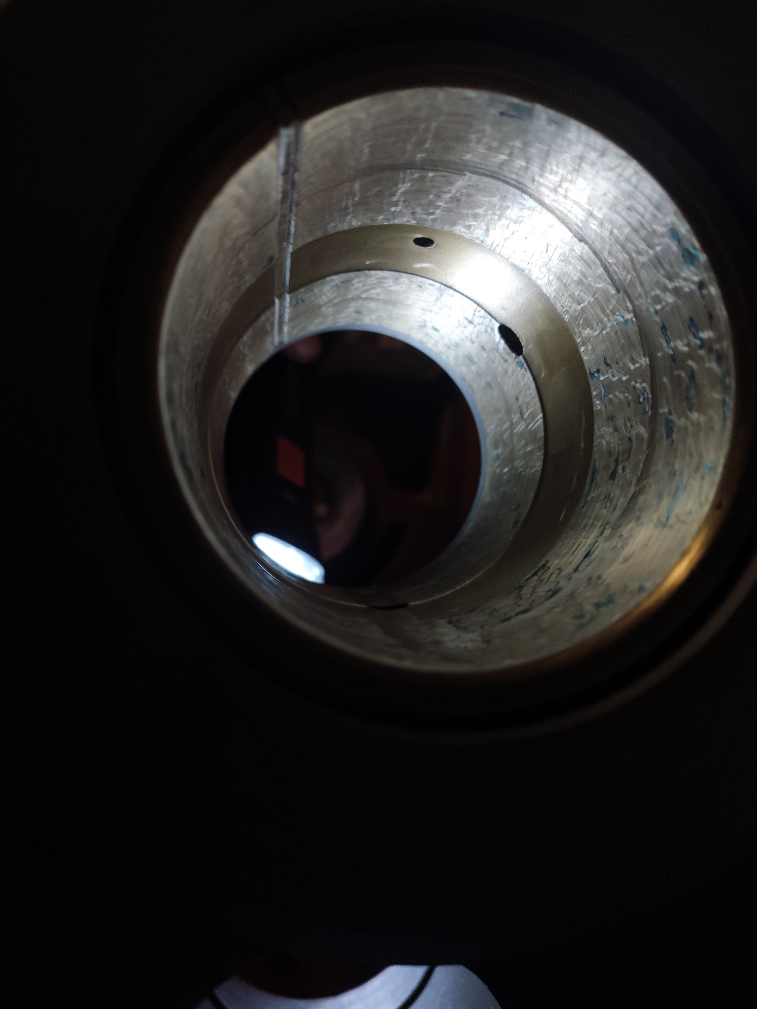 Po dlouhé době jsem se konečně dostal k soustruhu. Opsal jsem vřeteno do ložisek a lože na koníka. Dělal jsem to poprvé, možná podruhé, s olejovou barvou od Umton (pruská modř), ale minimálně to vřeteno vypadá opsané docela slušně. Co říkáte na: