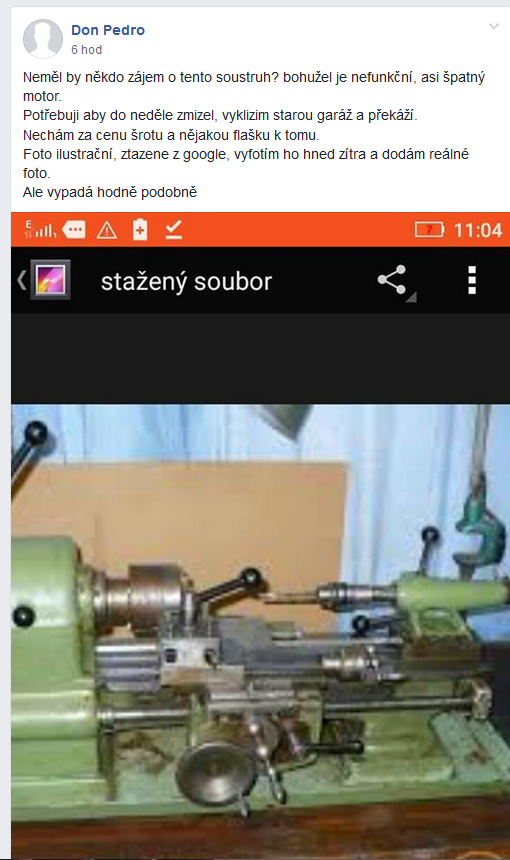 Na ten inzerát jsem reagoval jako druhý... Psal jsem mu sz. Nakonec z něj vypadlo, že to dával i v jiných skupinách a než byl schválen příspěvek v bazar nářadí, tak měl zájemce za 20k...