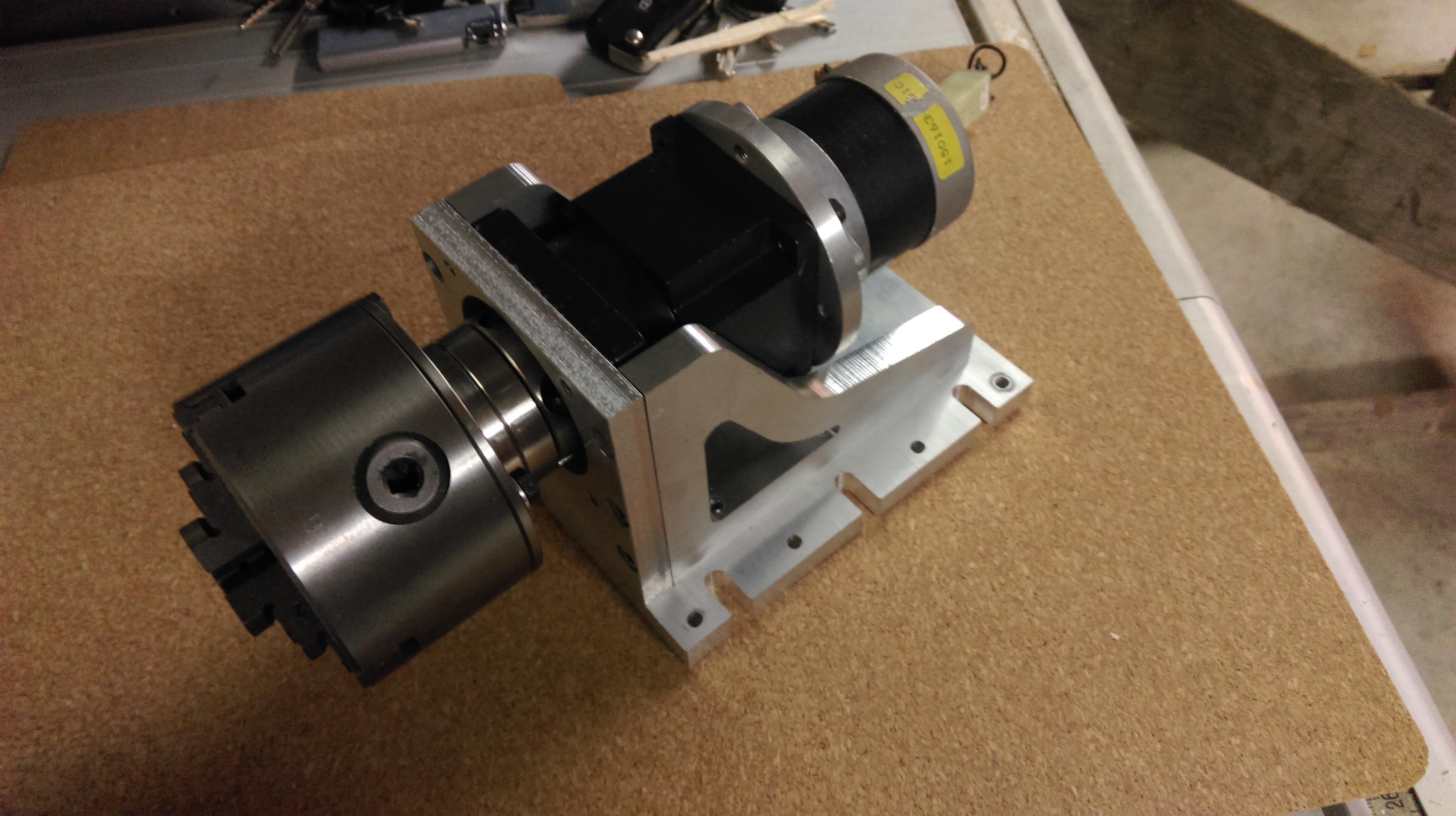 Jako základ slouží harmonická převodovka 1/100 z ebaye nekde z Izraele. Kupodivu přišla v pořádku a byla za hubičku ve srovnání s tim co se tam běžně vyskytuje. K tomu krokovy motor ze šuplíku a 80mm univerzála.