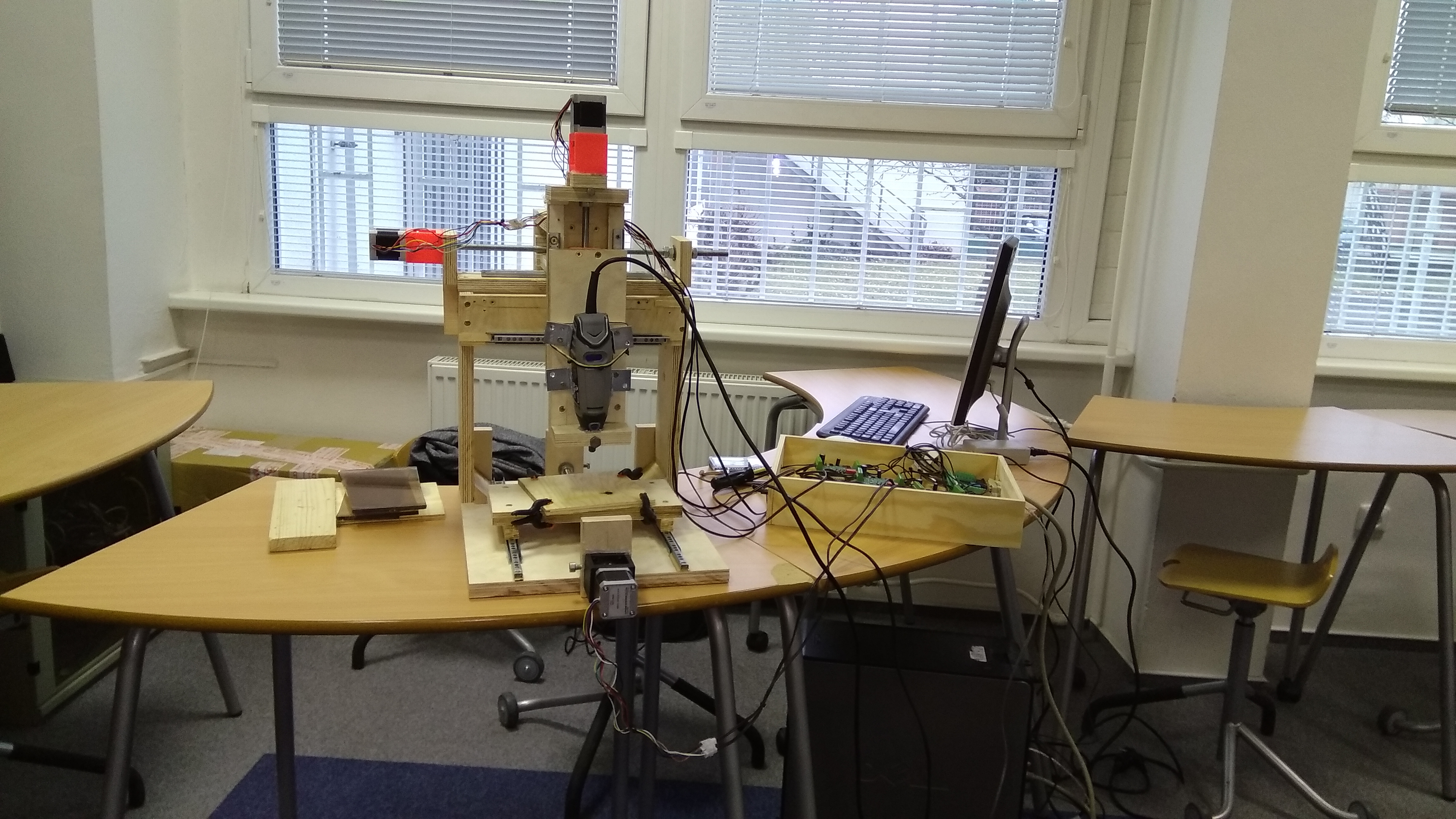 Zkus obrobek vypodkládat tak, aby Zko obrábělo co nejvejš (tj. výsuv byl vysunutej co nejmíň), jestli to trochu nepomůže. Na dráty k motorům si kup tenký husí krky a nějak je zafixuj ke konstrukci (inspirace).