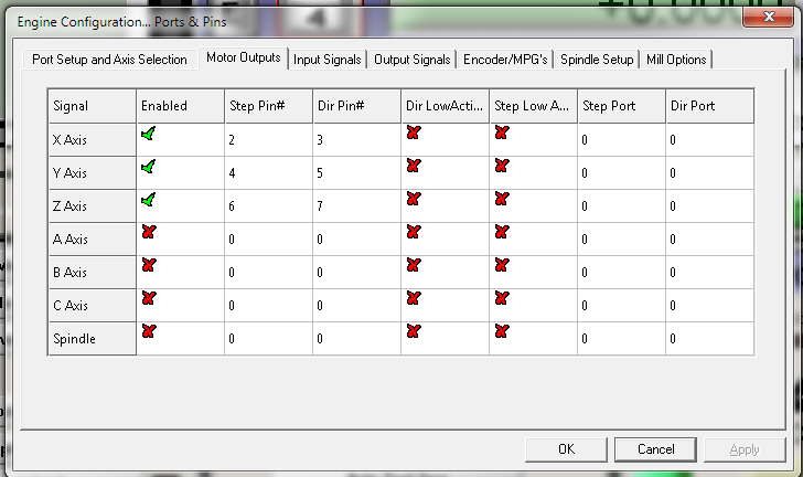 Na tý desce máš u každýho vstupu a výstupu napsaný číslo odpovídajícího LPT pinu. Tyto čísla vyplníš do Config -> Ports & Pins. Např. Step pin # pro X je 2, Dir pin # pro X je 3, pro Y jsou to 4 a 5 atd. Asi takto by to mohlo u tebe vypadat: