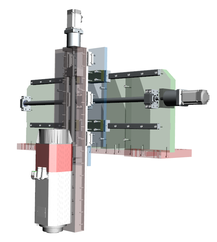 Zdravim, takmer vsetky diely su z konstrukcnej ocele. okrem Os Y ktora je z hlinika koli dynamike. Drziak vretena je tiez zelezny z 3 dielov. Najprv som chcel polotovar pod kolajnice navarit, zmenili sme to na srobovany spoj s kolikmi a lepidlom. Nasledne sa opracovali kolajnice.