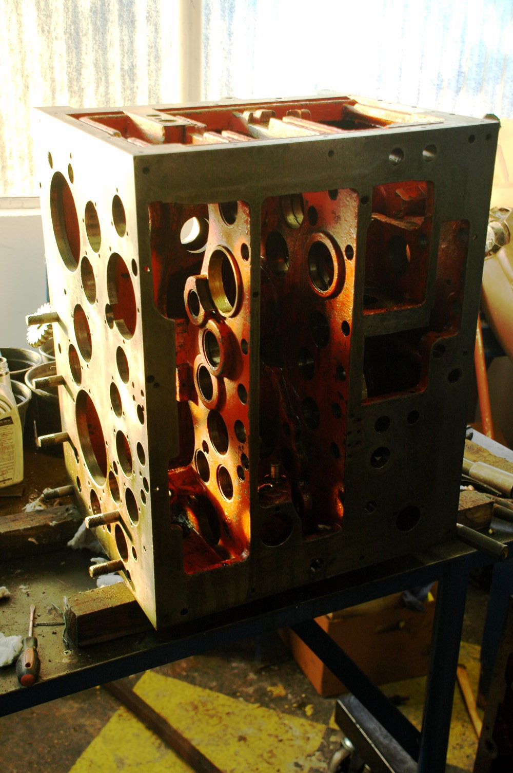 chybí jen tři dekly, ty jsou dole kvůli kontrole mazání, a motor, ten čeká na ložiska, jinak je komplet