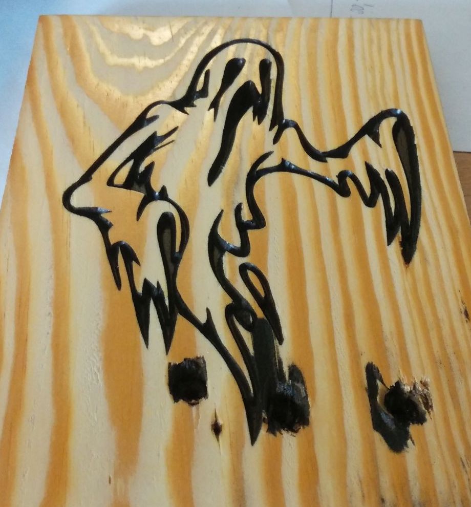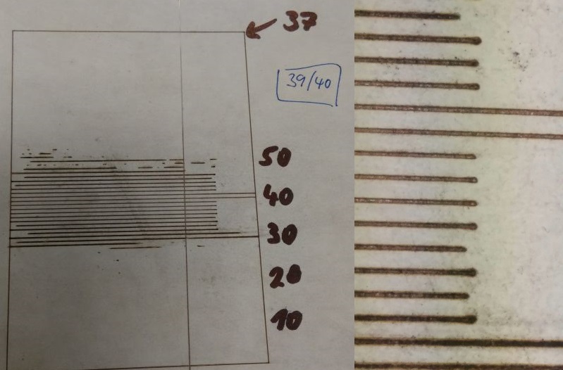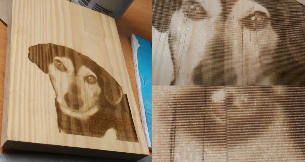 - laser vypali 85 car dlouhych 50mm s 1mm odstupem. Zacina se v miste, ktere je tak nizko, ze paprsek je rozostreny. Laser nakresli caru, zvedne se o 1mm a posune o 1mm v Y a nakresli dalsi caru, a to cele opakuje 85x A zkouska vypalovani fotky do prkna (jezevec, zvetseno a detail oka). Ty svisle cary jsou od toho, ze prkno nebylo zfrezovano ani nijak vyhlazeno, jen jsem zkousel jestli pujde pomoci PWM smenit odstin):